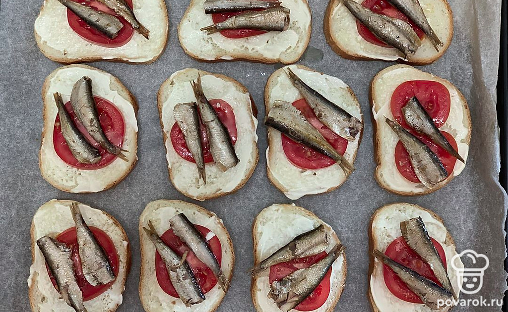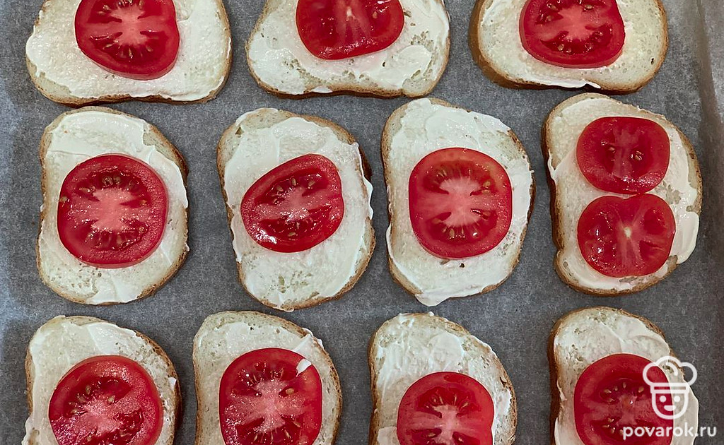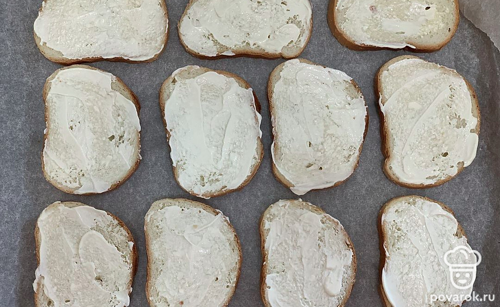 Хлеб выложить на противень, покрытый пергаментом, смазать майонезом.