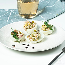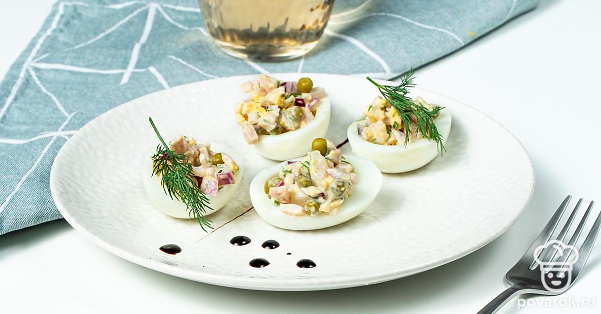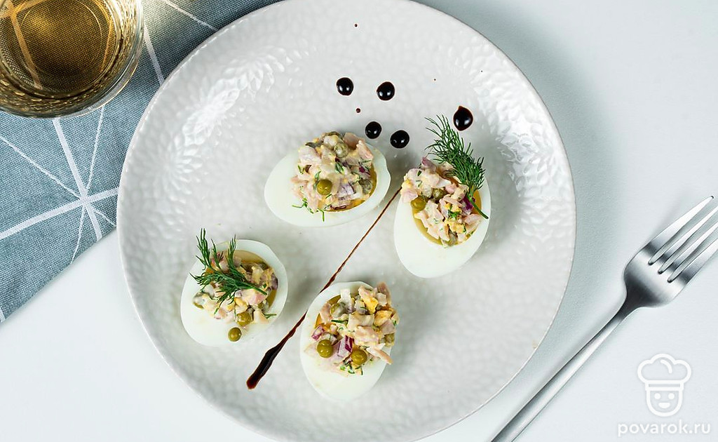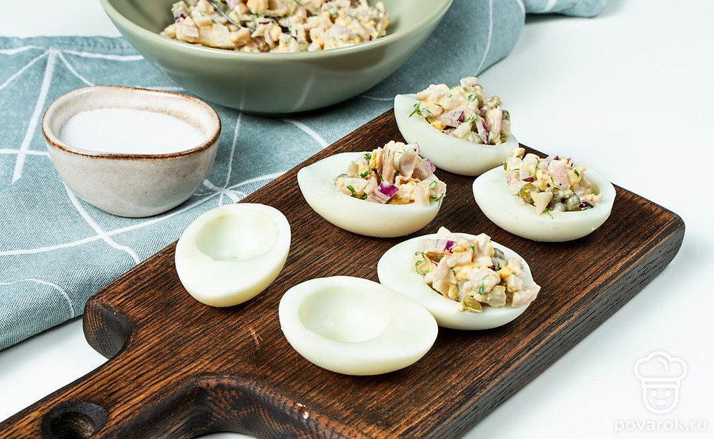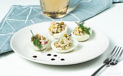 Яйца, фаршированные кальмарами — закуска с нежной начинкой и очень приятным вкусом. Блюдо будет красивее смотреться, если приготовить его из деревенских яиц с ярко-желтыми желтками. Главное, не переварить яйца. От этого они становятся синеватыми. Такую закуску хорошо готовить не только для гостей, но и для себя. Например, на ужин, который по мнению диетологов, должен состоять в основном из легкоусвояемых белков.