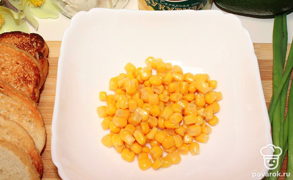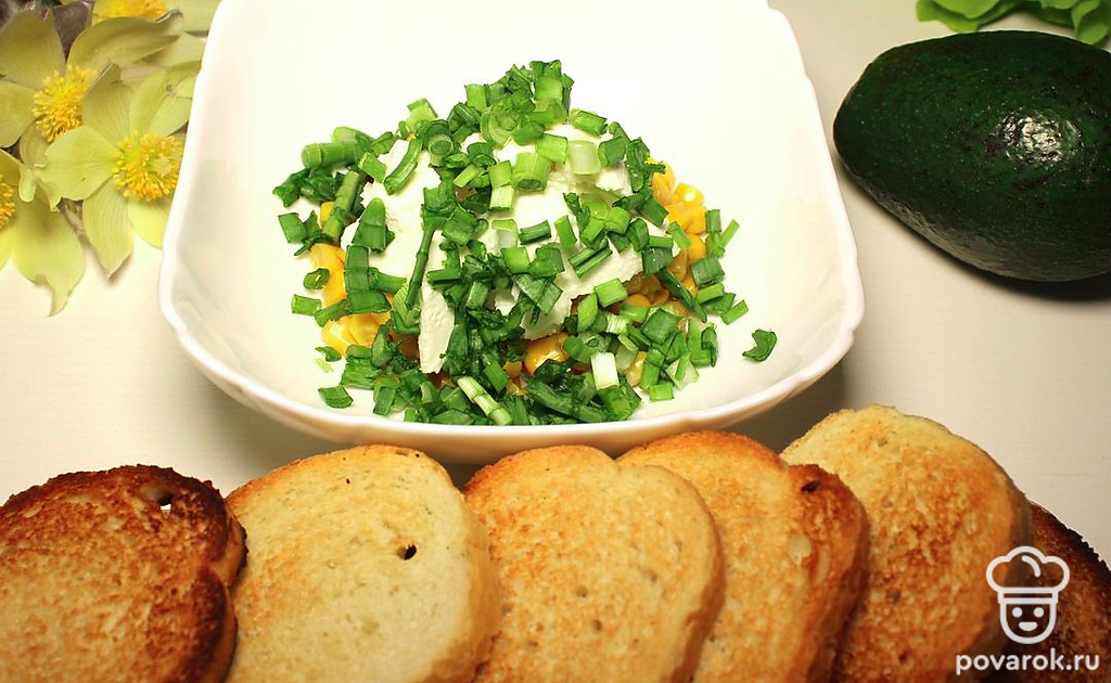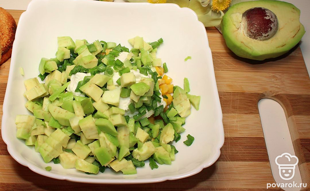 Чистим авокадо и добавляем к остальным ингредиентам, все перемешиваем.