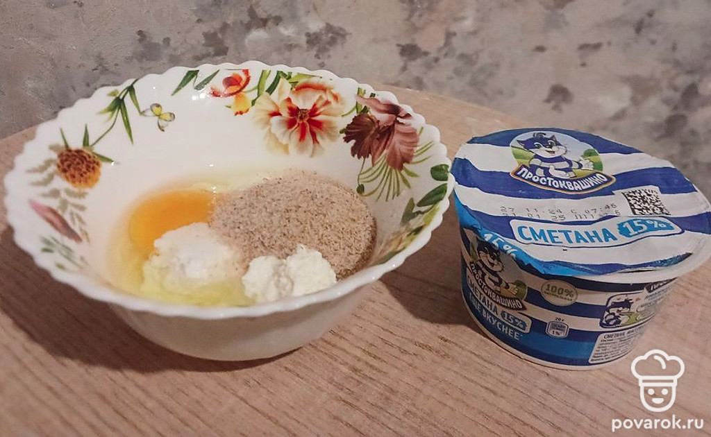 Яйцо смешайте со сметаной, солью и творогом.