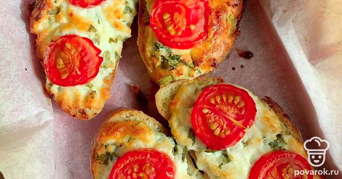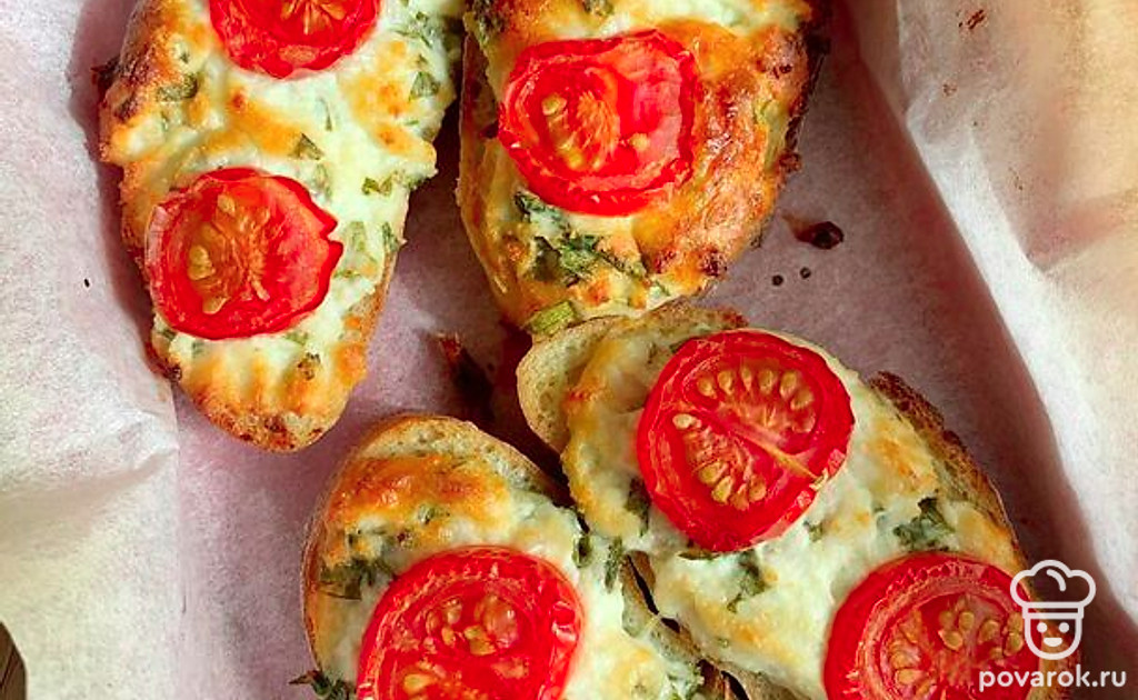 Сверху положите кругляши помидорок. Выпекайте в разогретой до 180 градусов духовке около 15 минут. Бутерброды готовы.