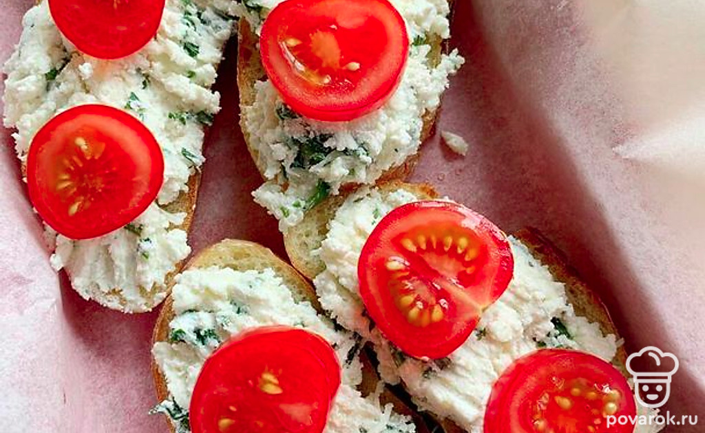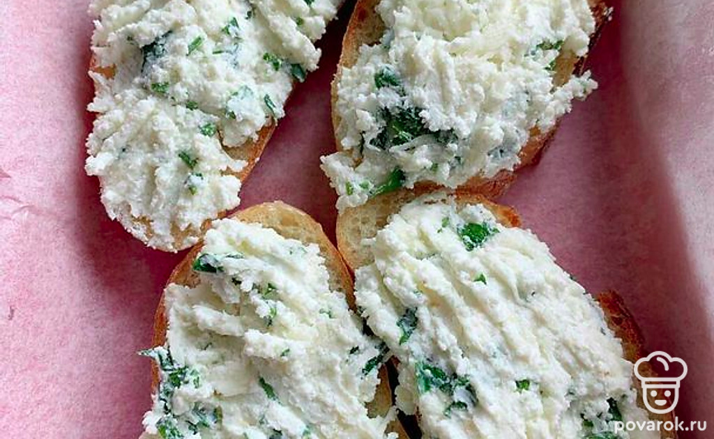 Сыр натрите на мелкой терке, зелень измельчите, смешайте творог, сыр, зелень и чеснок. Выложите массу сверху на подсушенный багет.