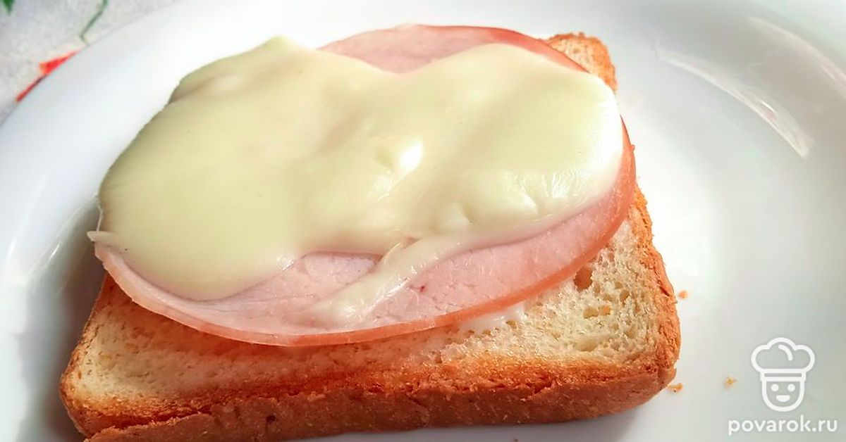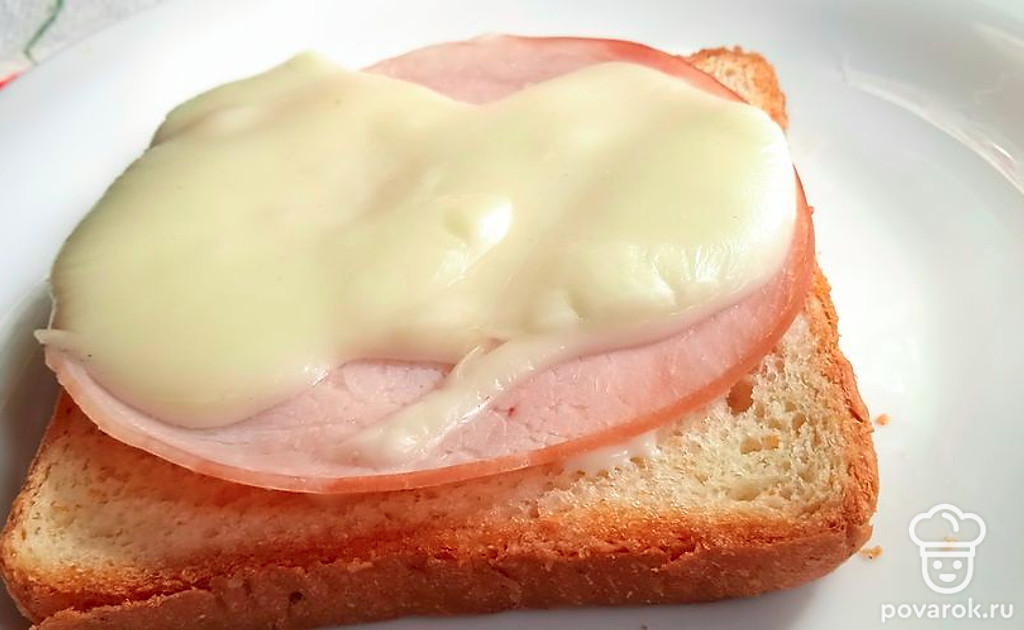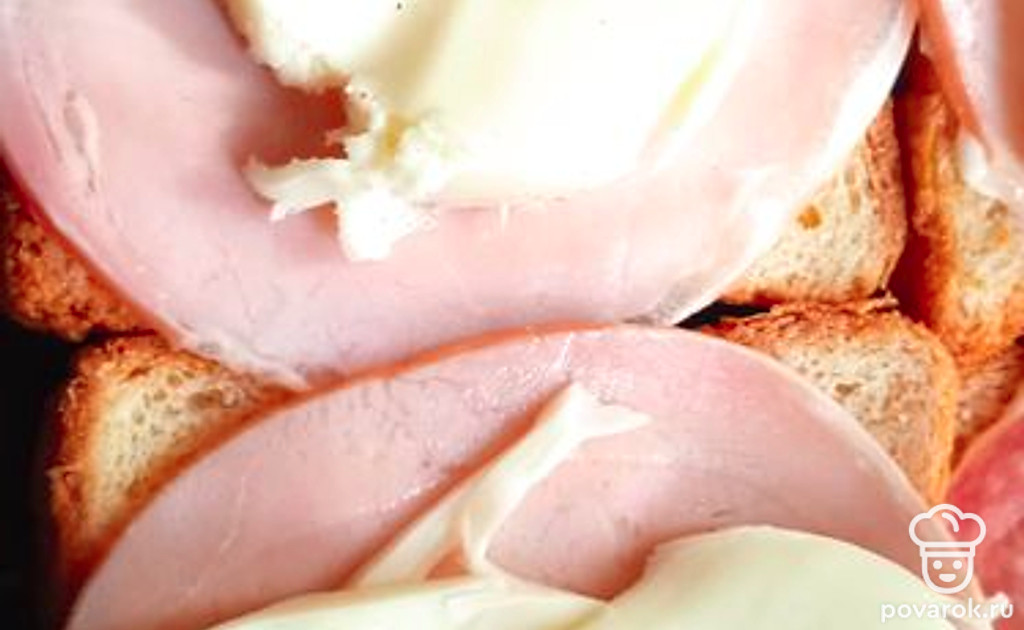 На ветчину положите ломтики сыра. Поставьте в духовку, разогретую до 220 градусов на пять минут.