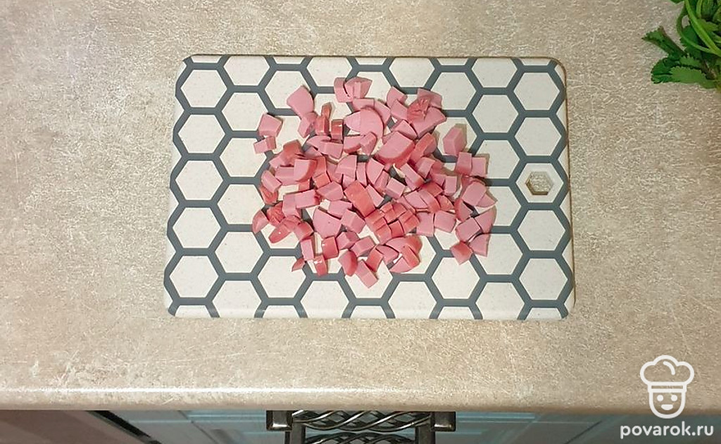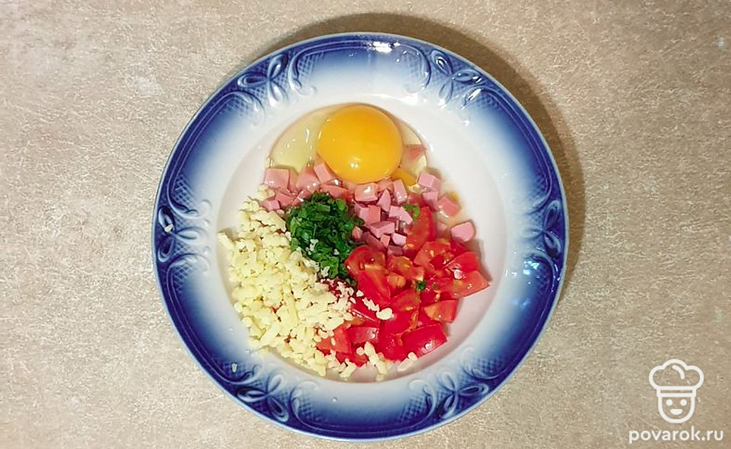 Зелень помойте и мелко нарежьте, положите в глубокую тарелку. К зелени разбейте яйцо, положите сыр, колбасу и помидор. Посолите и поперчите, хорошо перемешайте.