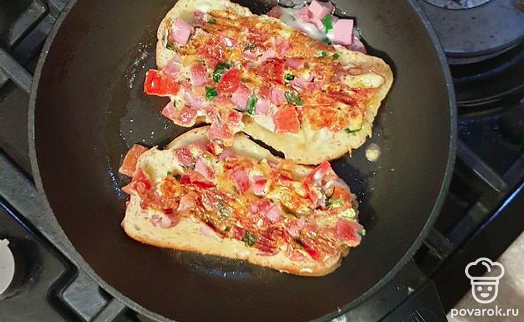 Хлеб нарежьте на кусочки и на каждый сверху выложите подготовленную начинку. На разогретую сковороду быстро выложите бутерброды начинкой вниз. Как только начинка схватится и пропечется, переверните бутерброды и поджарьте с другой стороны.