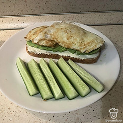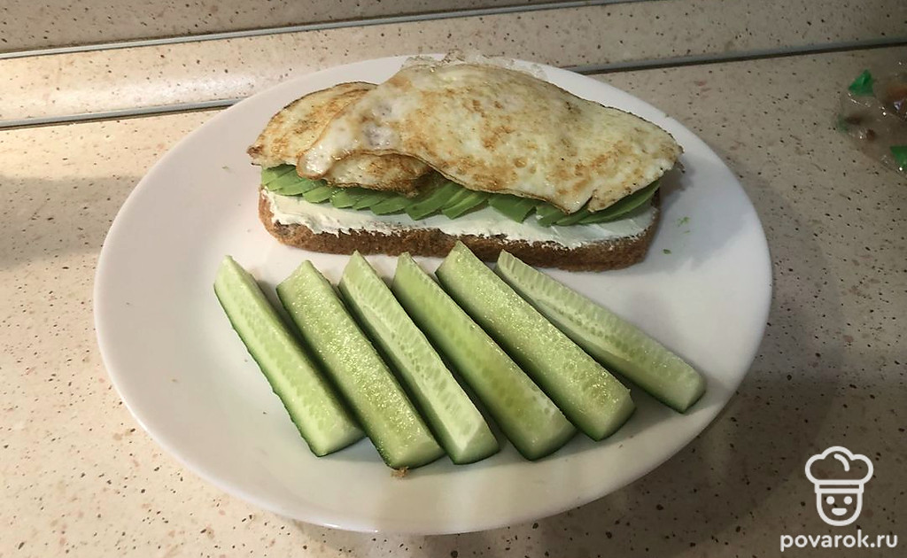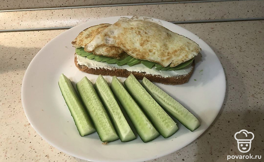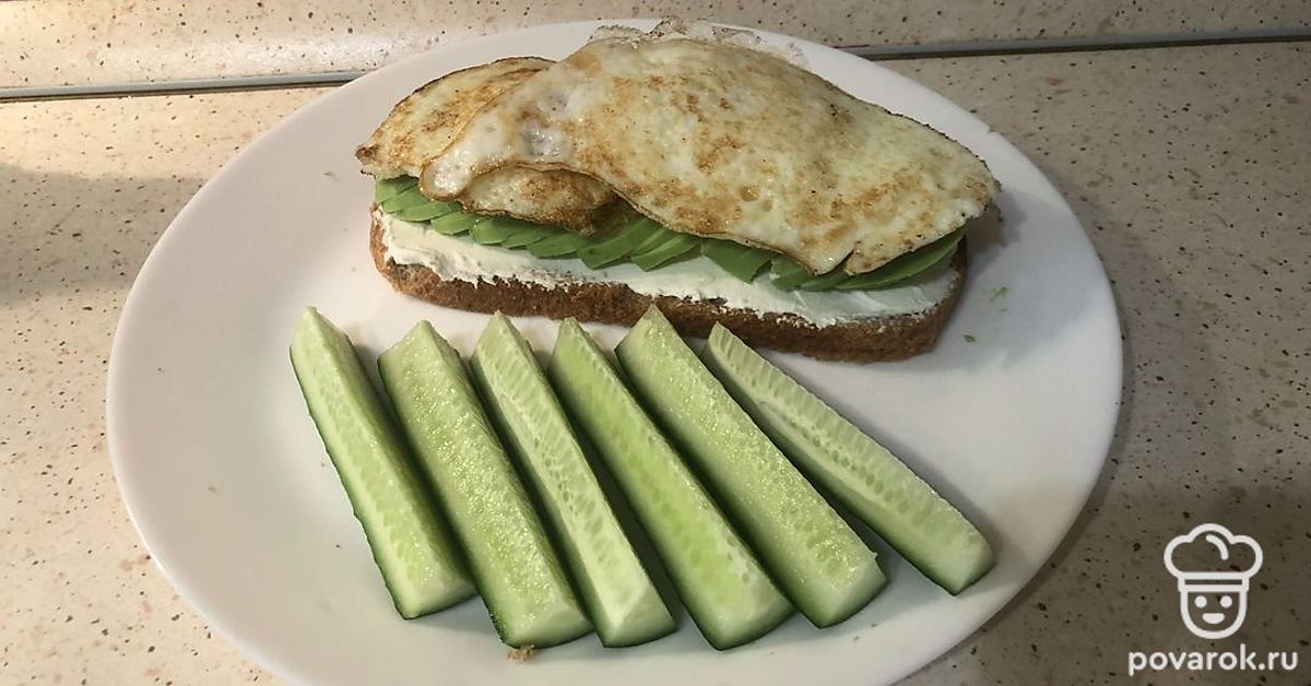 Сытный завтрак из яиц, авокадо и творожного сыра на сером хлебе