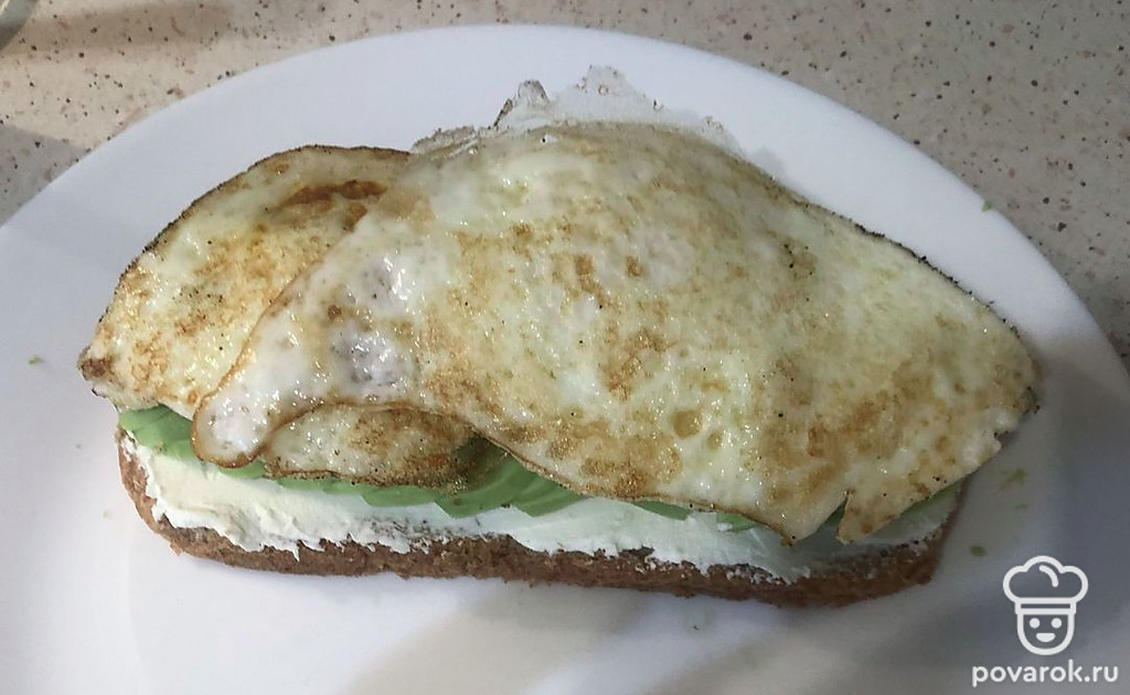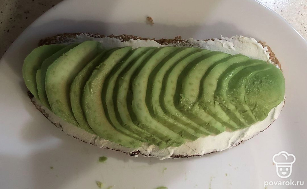 Намажьте на хлеб творожный сыр и положите авокадо.