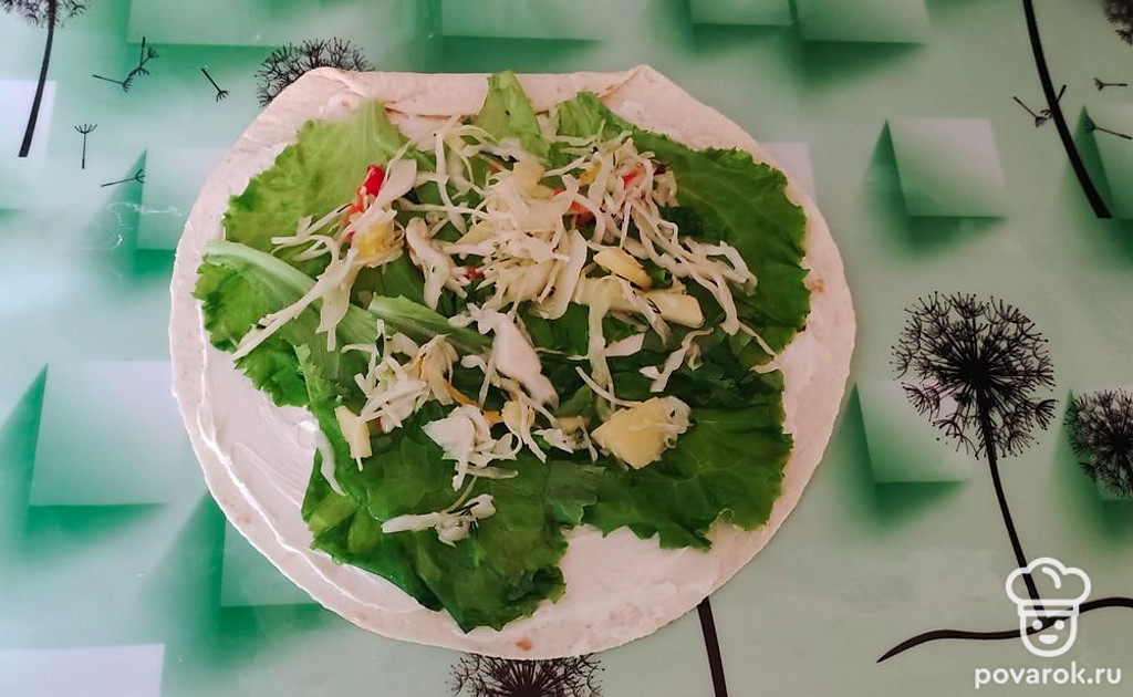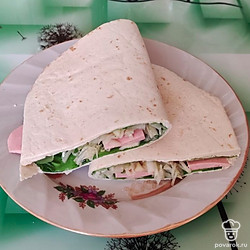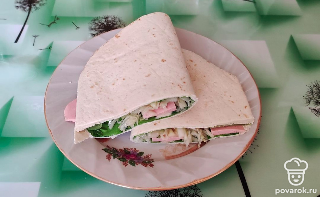 Тортилью сворачиваем пополам и разрезаем на две половинки. Можно подогреть в микроволновке или слегка поджарить на сковороде. Приятного аппетита!