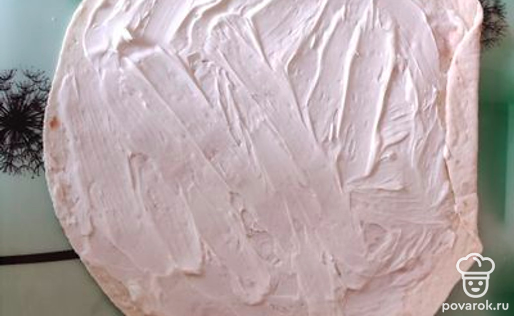 На тортилью равномерно распределяем творожный сыр.