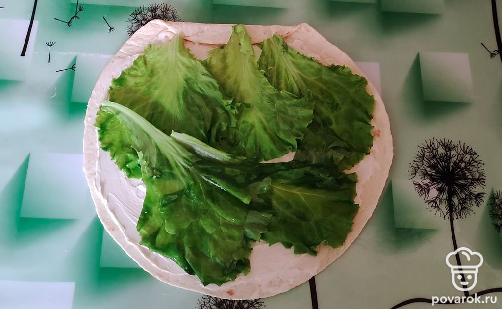 Затем укладываем листья салата.