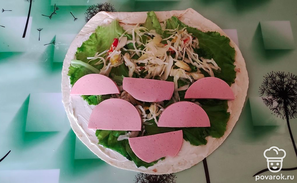 Далее колбаса, нарезанная полукольцами.