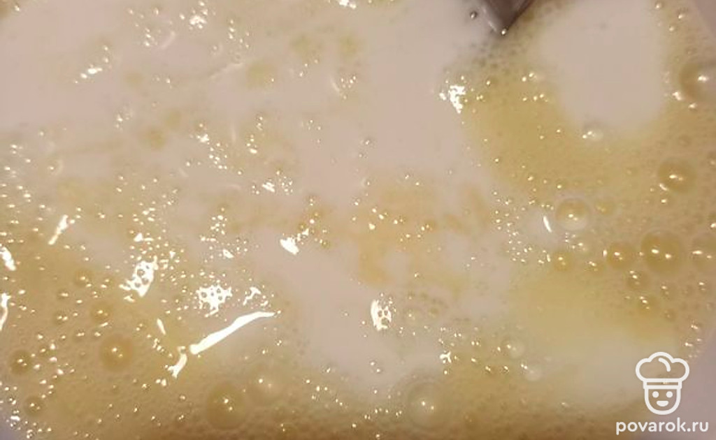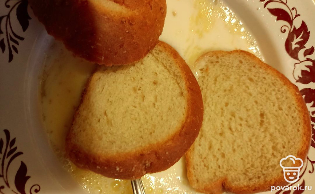 Хлеб нарезать на кусочки и замочить в смеси из молока и яиц.