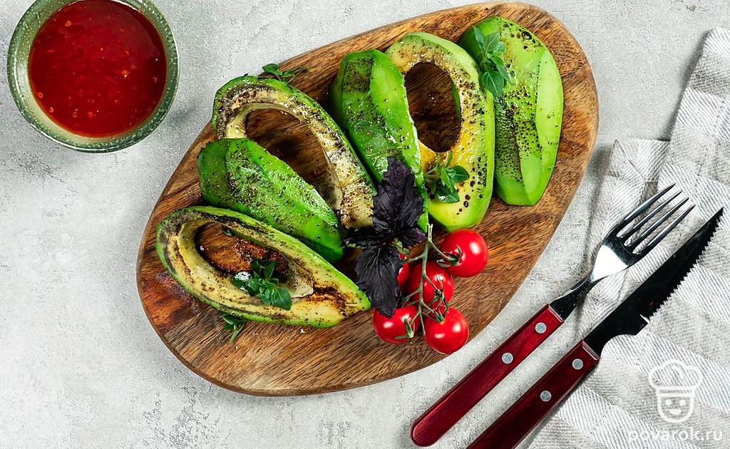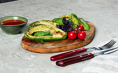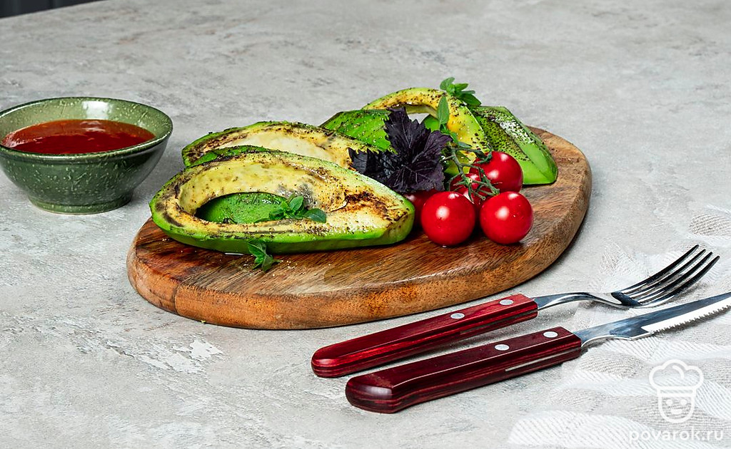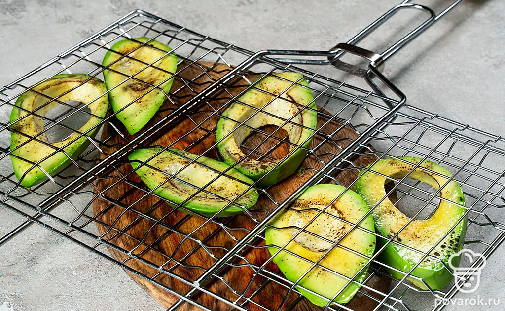 Авокадо-гриль — отличная закуска для пикника на природе, очень сытная и полезная. Ее можно подать как к мясу, так и к рыбе. Главное — соблюдать несколько правил при приготовлении этого блюда. Нужно нарезать плоды одинаковыми кусочками среднего размера, чтобы они не провалились между прутьями решетки. Во время обжарки авокадо не нужно солить и перчить, потому что оно может потерять влагу и получиться пересушенным.