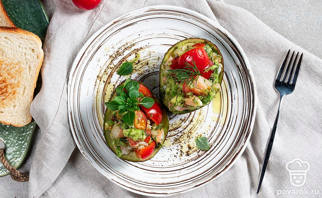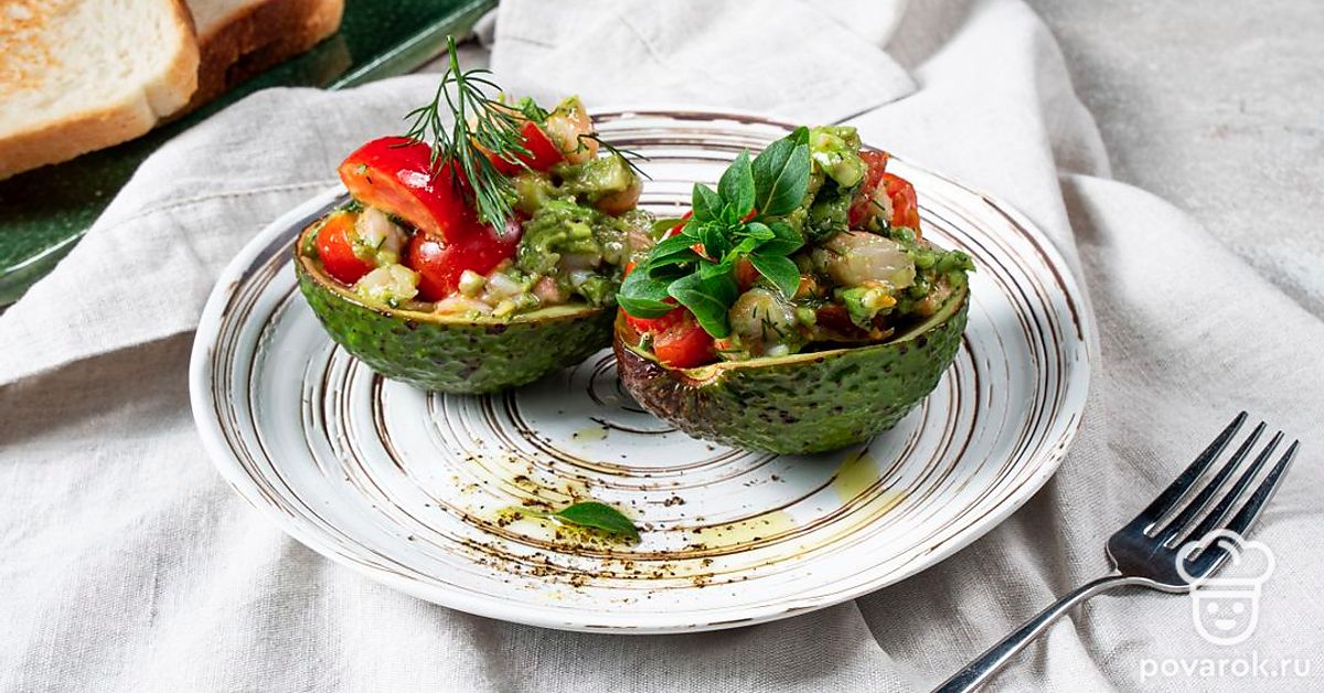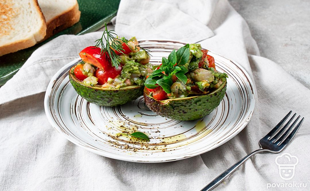 Авокадо, фаршированное креветками — простая и очень вкусная закуска, которая украсит любой праздничный стол. Блюдо получается довольно сытным, при этом полезным, благодаря авокадо и креветкам. Заправить такую закуску можно любым маслом. Приверженцам правильного питания желательно отдать предпочтение оливковому, льняному или маслу из виноградных косточек.