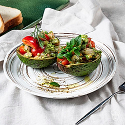 Сделайте салат. В миске соедините все ингредиенты: мякоть авокадо, томаты черри, креветки и укроп. Посолите и поперчите по вкусу. Добавьте орегано, растительное масло и лимонный сок. Все тщательно перемешайте. Выложите начинку в лодочки из авокадо.