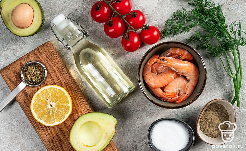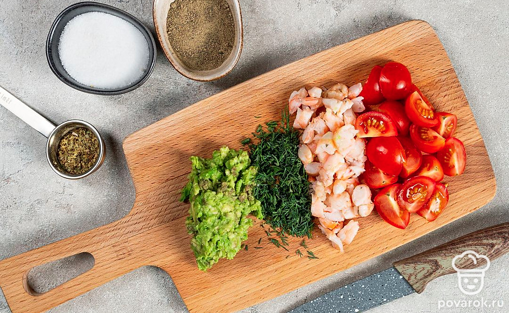 Заранее отварите креветки, остудите. Вымойте томаты, авокадо и укроп. Обсушите зелень бумажными полотенцами. Удобно разложите на столе необходимые продукты.