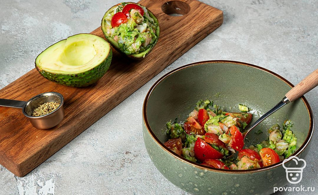 Подготовьте ингредиенты для блюда. Авокадо разделите пополам, аккуратно выньте косточку. С помощью ложки отделите мякоть авокадо. Разомните мякоть вилкой. Томаты черри мелко нарежьте. Креветки нарубите. Укроп накрошите.