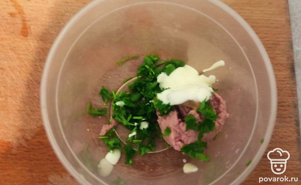 Смешаем паштет, нарезанную зелень, сметану.