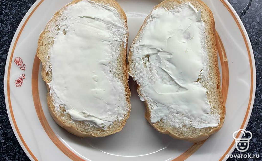 Батон намазываем творожным сыром.
