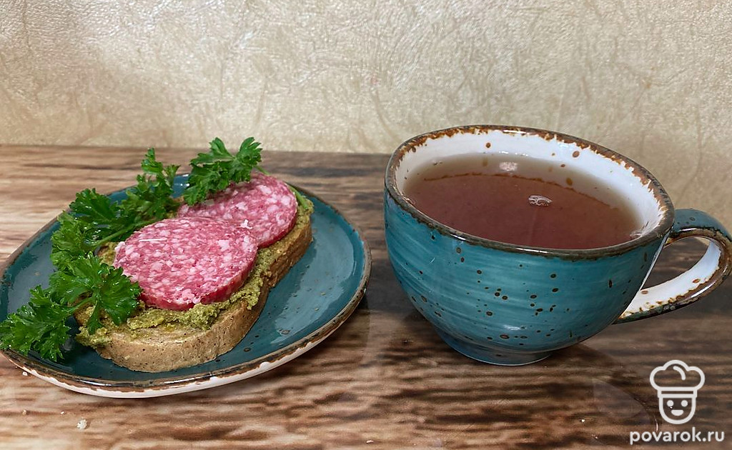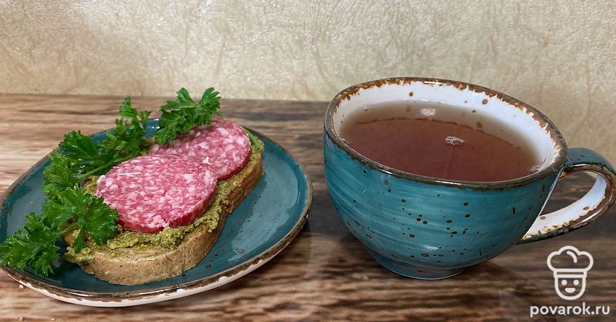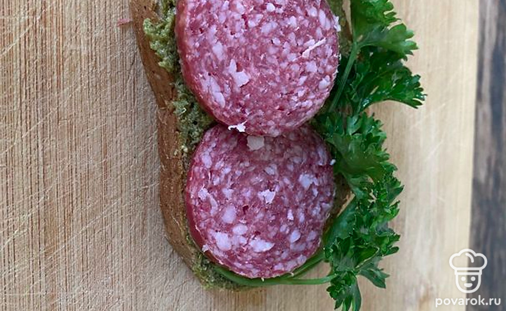 Намажьте на подсушенный хлеб соус песто, положите салями, украсьте петрушкой.