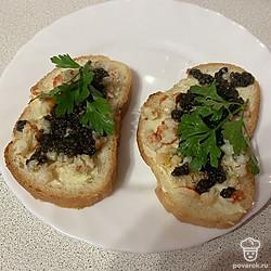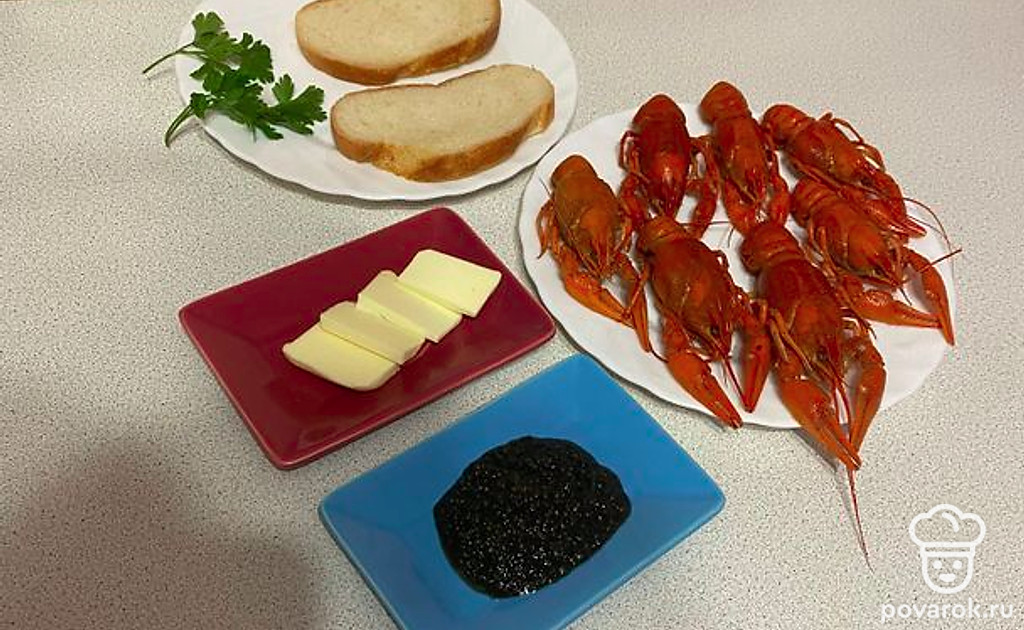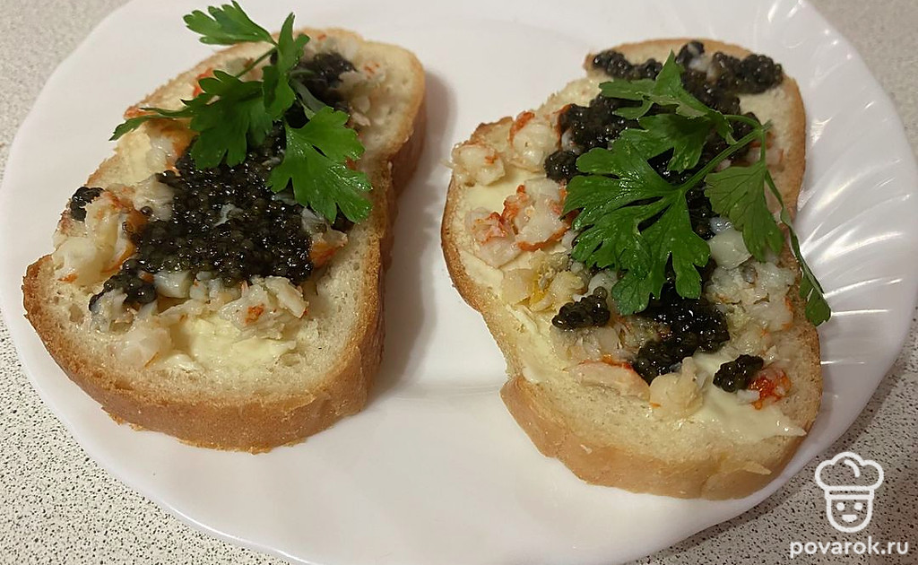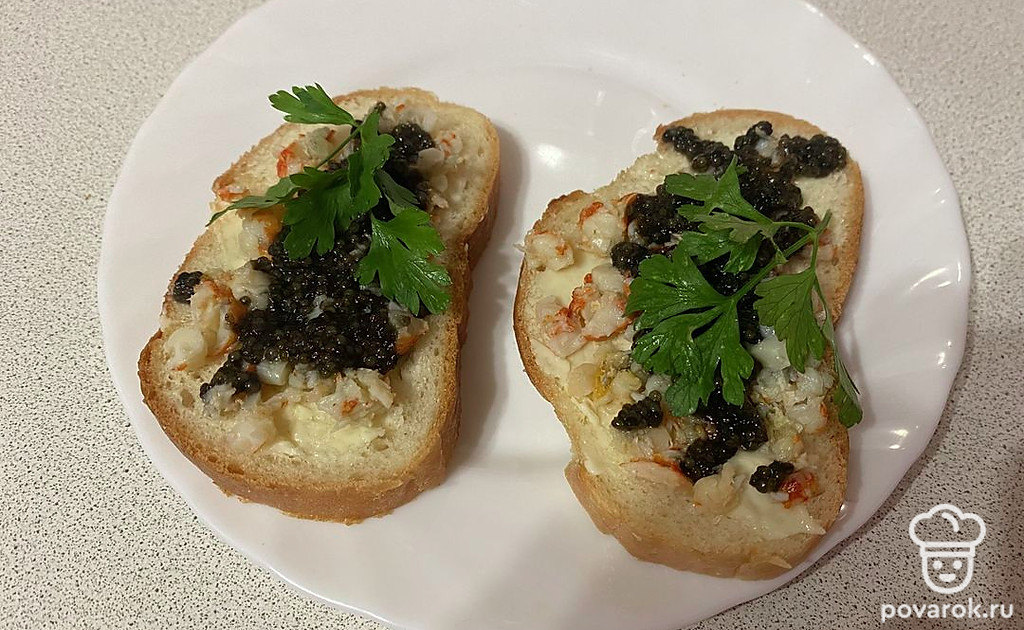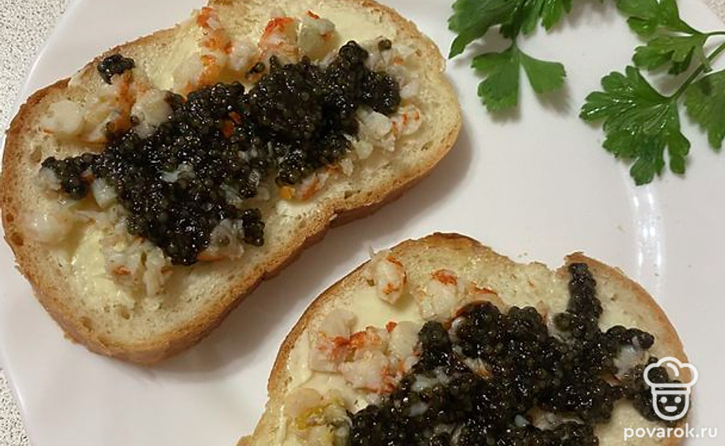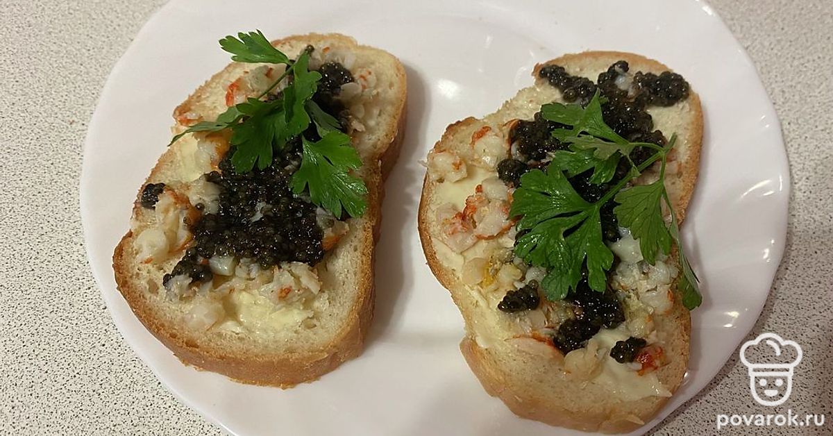 Изысканные бутерброды для праздничного стола с черной икрой и мясом рака.