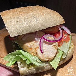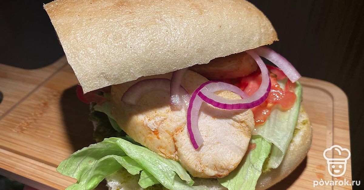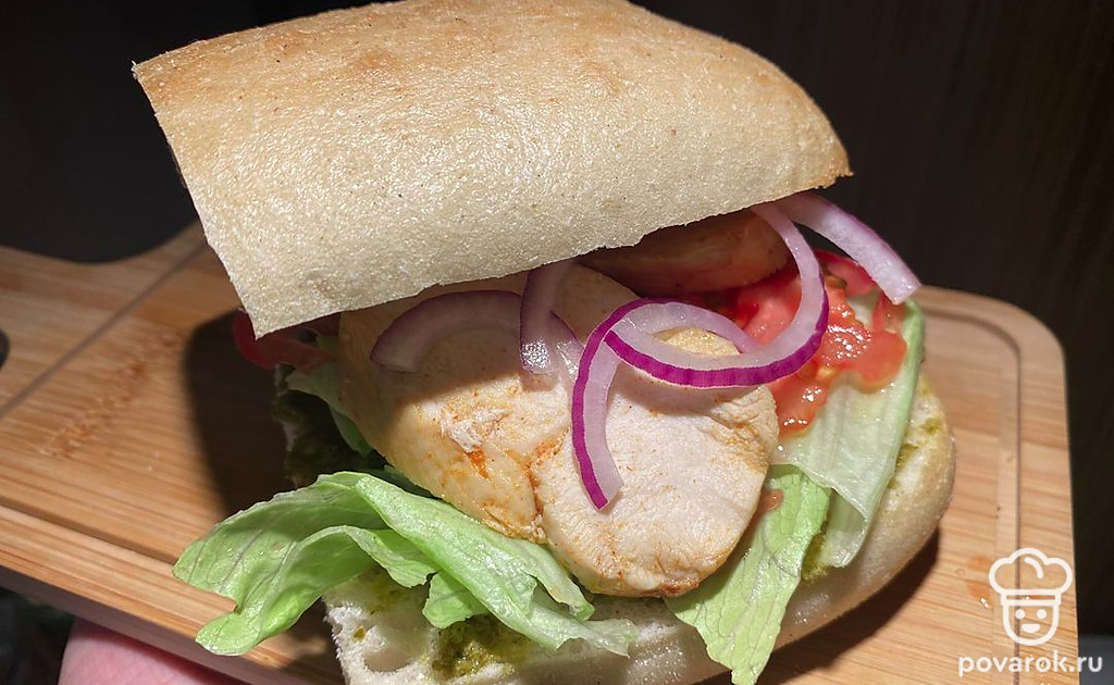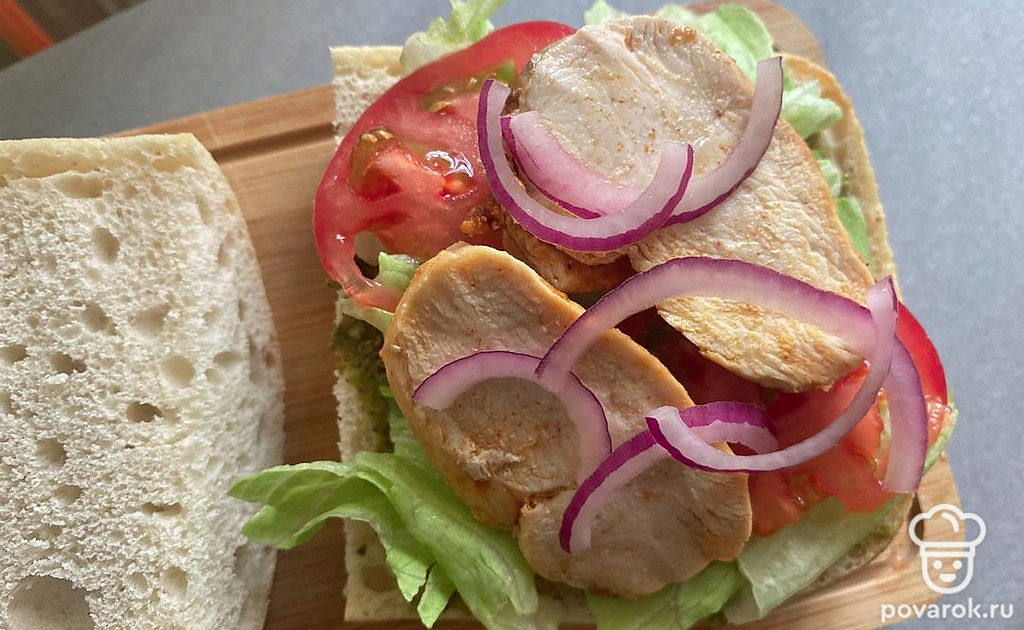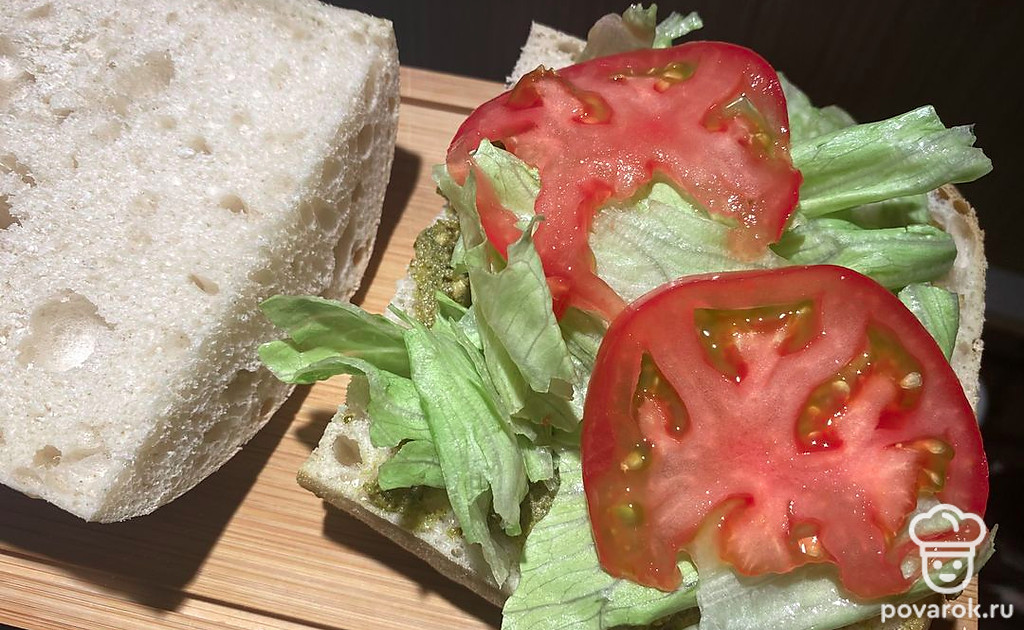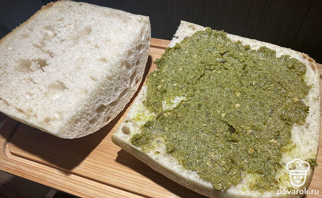 Чиабатту разрежьте вдоль. Если она очень большая как у меня, можно использовать половину. На одну половинку намажьте песто.