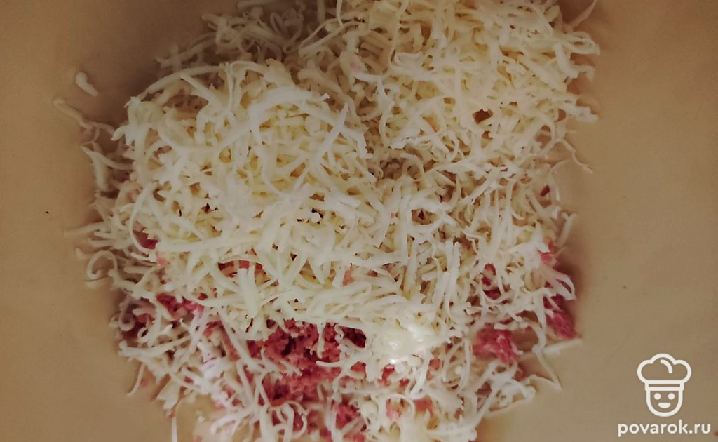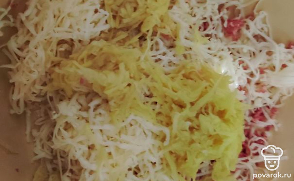Картошку очистить, помыть, натереть на мелкой терке, отжать и добавить к колбасе с сыром.
