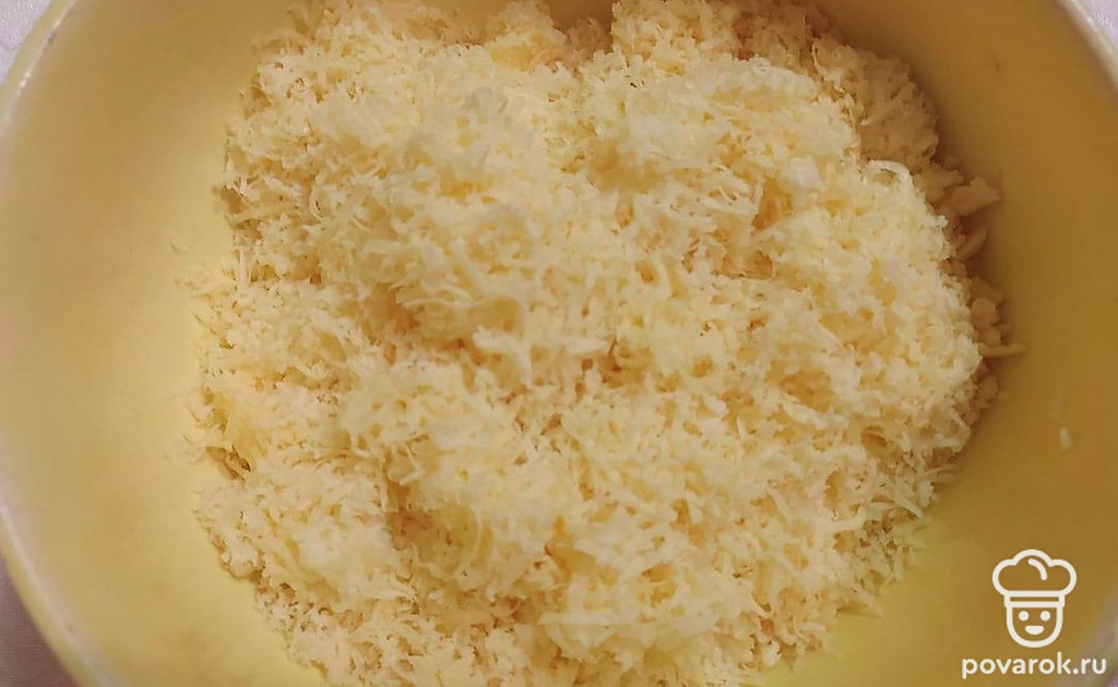 За ранее приготовленный сыр, выньте из холодильника, снимите с него пленку и натрите на крупной или мелкой телке, по вашему усмотрению. Если сыр все же пристает к терке, тогда небольшим количеством растительного масла смажьте ту сторону терки, на которой вы будете натирать сыр, таким образом он точно не прилипнет к ней.