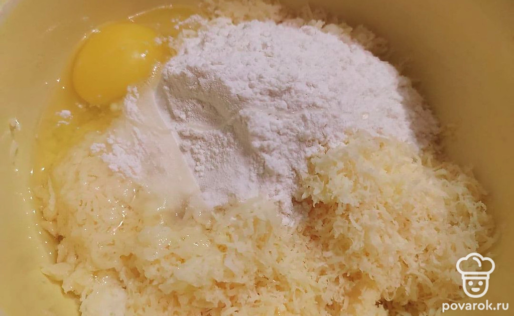 Переложите натертый сыр в удобную глубокую посуду, добавьте туда разбитое яйцо и просеянную муку. Все хорошо перемешайте до однородной массы.