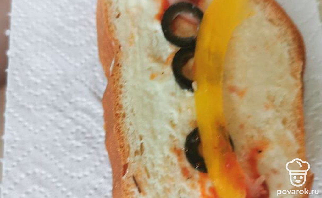 Положите на хлеб порезанный тоненькой соломкой перец.