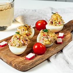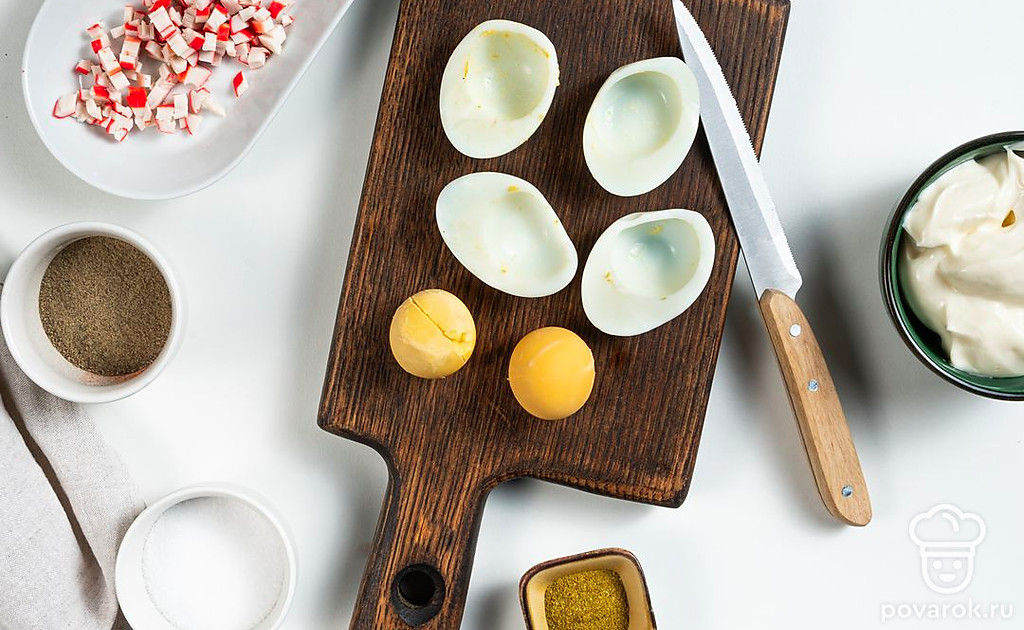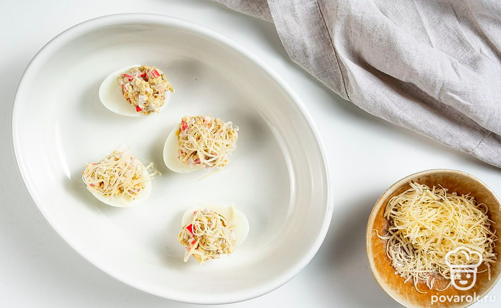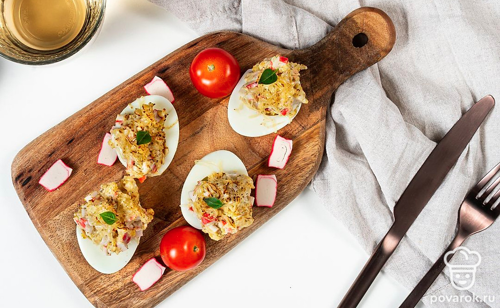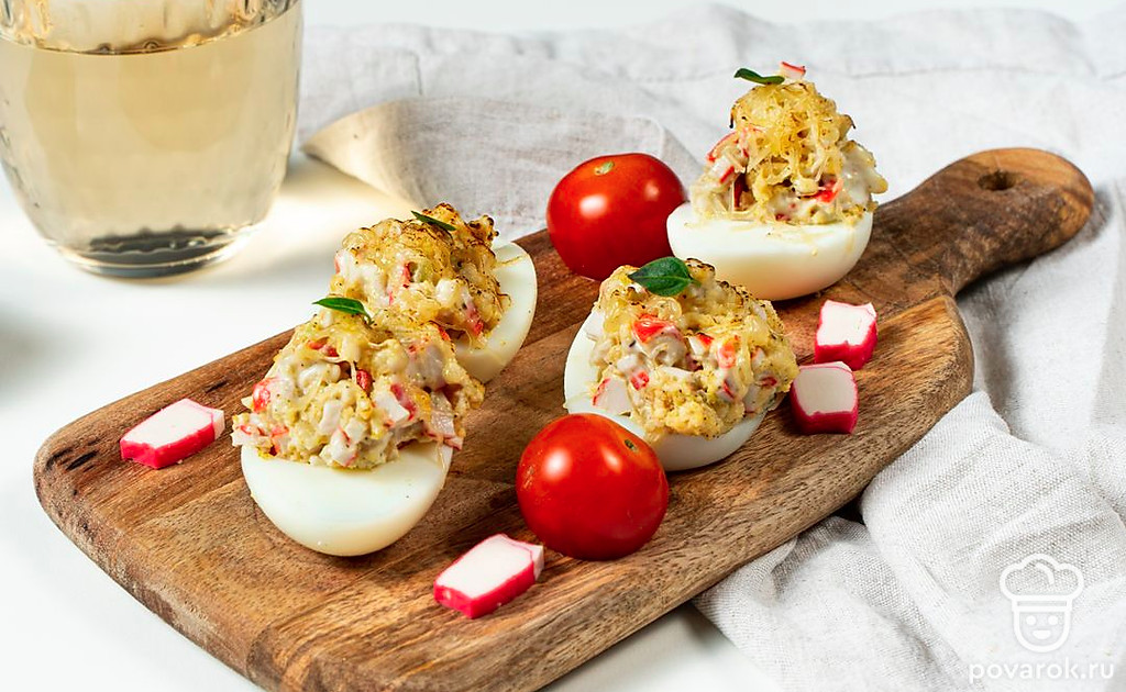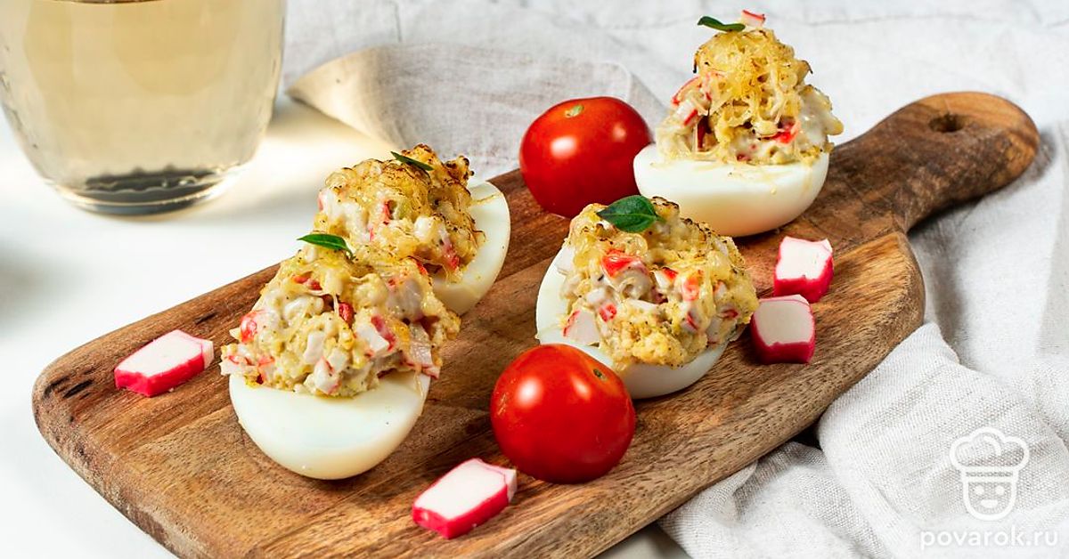 Яйца, фаршированные аппетитной начинкой — одна из самых удачных закусок для застолья. Готовится просто, выглядит нарядно и очень празднично. Обычно подают блюдо в холодном виде. Попробуйте запечь фаршированные яйца в духовке. Те, кто ни разу не фаршировал яйца, получат отличную кулинарную идею для торжественной трапезы. А те, кто уже пробовал делать такую закуску, будут приятно удивлены новым вкусом привычного блюда.