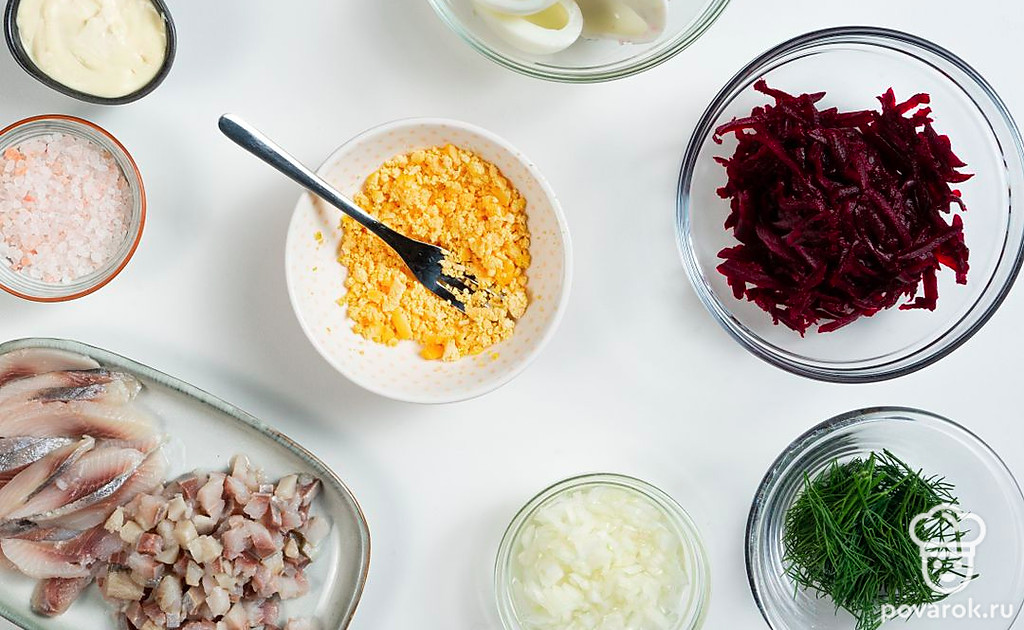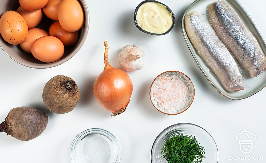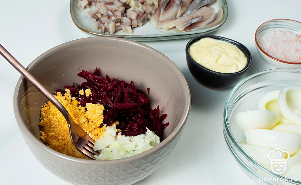 Подготовьте ингредиенты для начинки яиц. Яйца разрежьте пополам. Желтки уберите в отдельную посуду. Свеклу натрите на крупной терке. Лук измельчите. Залейте его уксусом и водой в равных пропорциях, оставьте мариноваться на 15 минут. Чеснок продавите в прессе. Селедку очистите, уберите косточки, разделайте на филе. Одну часть филе нарежьте мелко, другую — ломтиками. Желток накрошите.