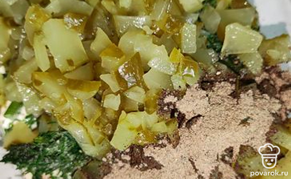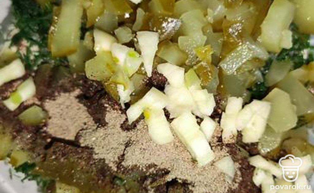 Мелко нарезаем огурчик и добавляем к майонезу. А также добавляем черный молотый перец.