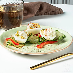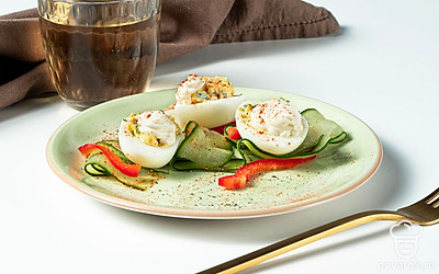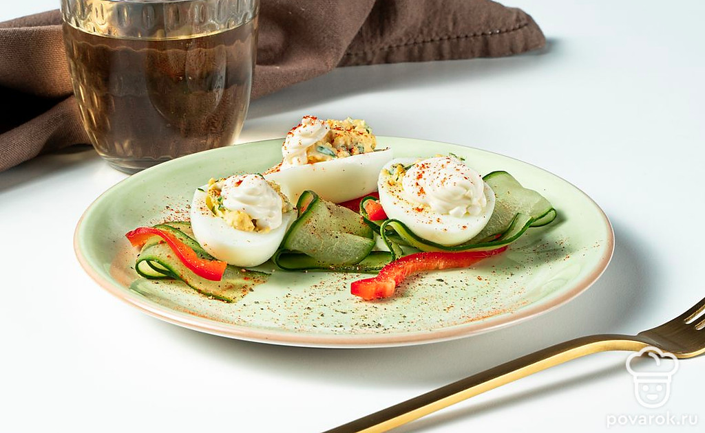 На сервировочном блюде разложите кольца сладкого перца, внутрь выложите тонкие круглые ломтики огурцов. Сверху на огурцах разместите фаршированные яйца с майонезом.