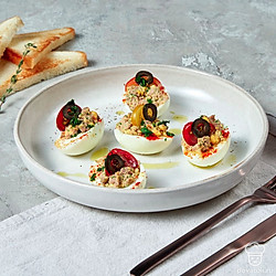 Приготовьте блюдо. Перемешайте ингредиенты в миске, разделите содержимое на 6 равных частей. В каждую половинку яиц разместите начинку.