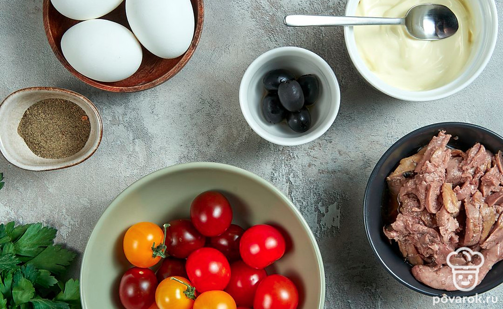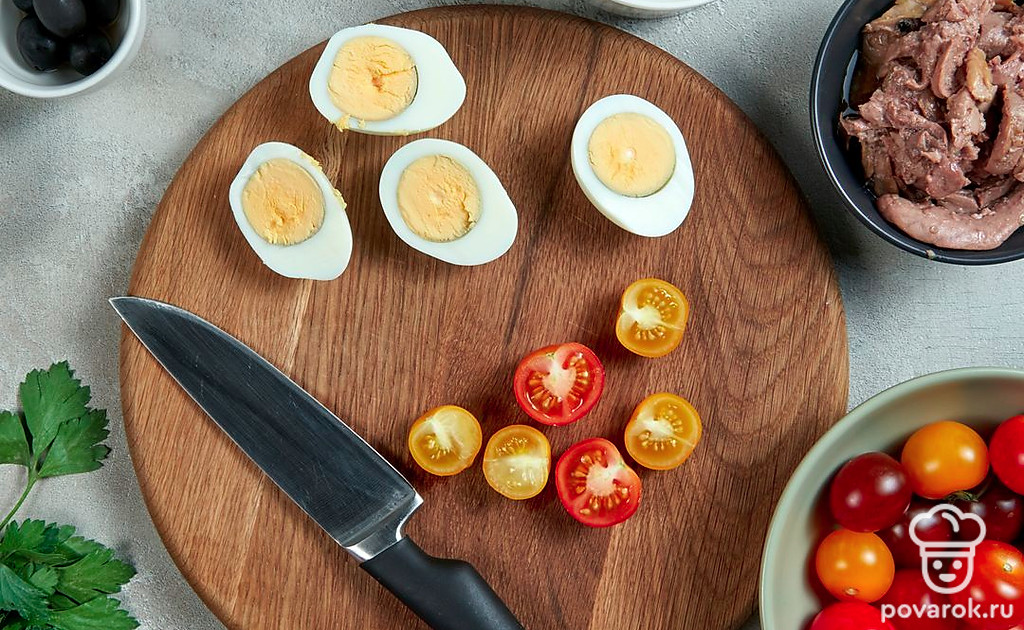 Куриные яйца промойте, сварите вкрутую, остудите и почистите от скорлупы. Печень трески выложите в отдельную миску. Петрушку вымойте и посушите. Маслины извлеките из рассола. Помидоры черри вымойте, просушите и разрежьте на половинки.