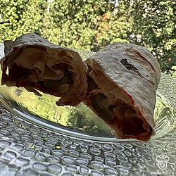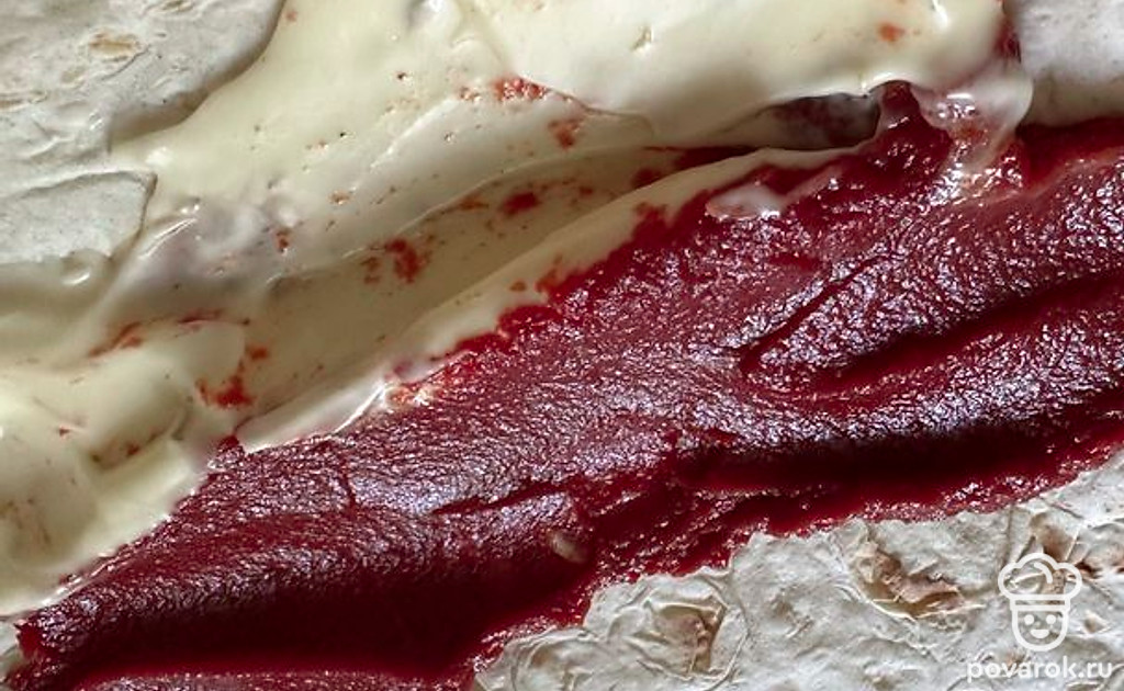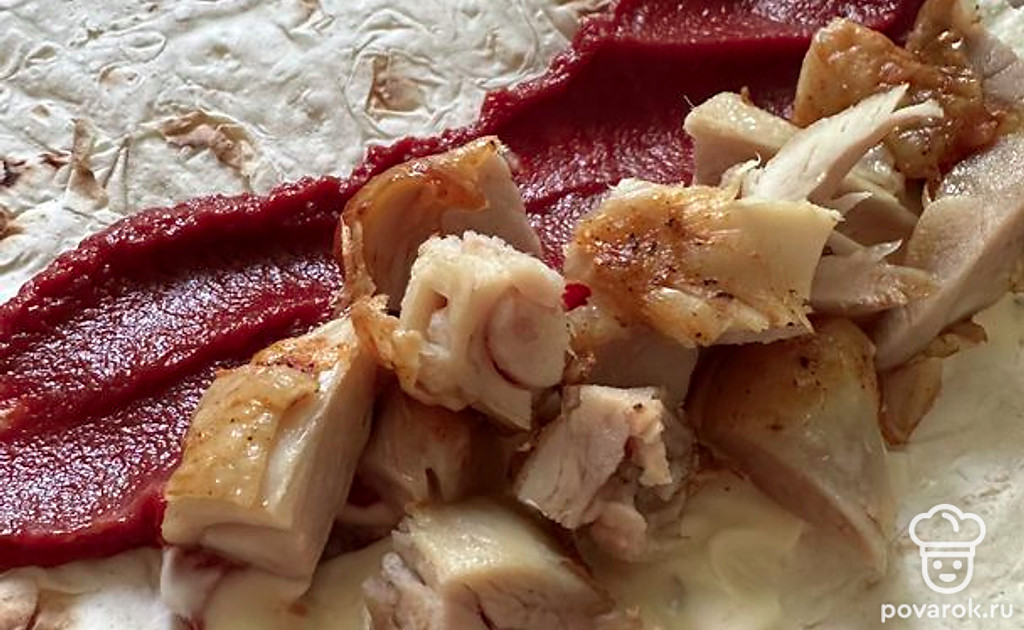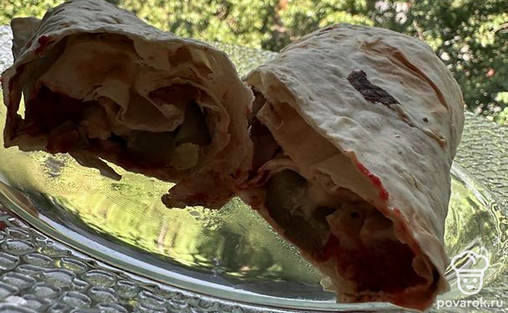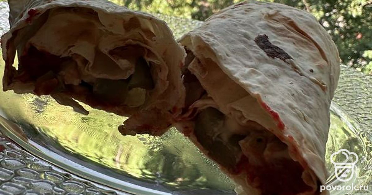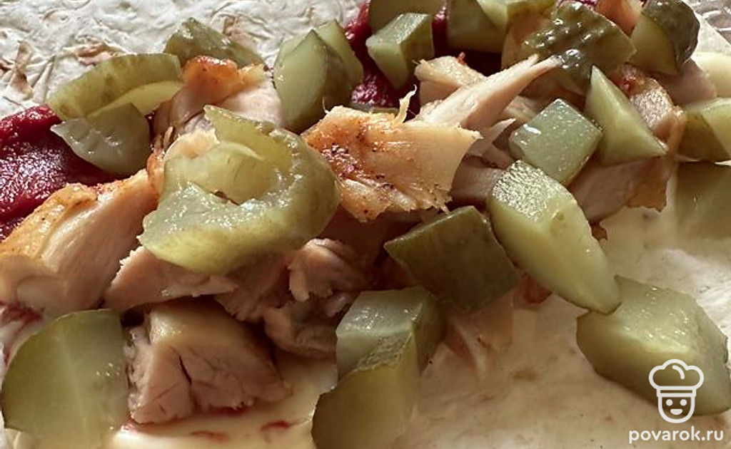 Нарезать соленый огурец и добавить к остальной начинке. Свернуть в рулет, обжарить 3 минуты на сковороде-гриль.