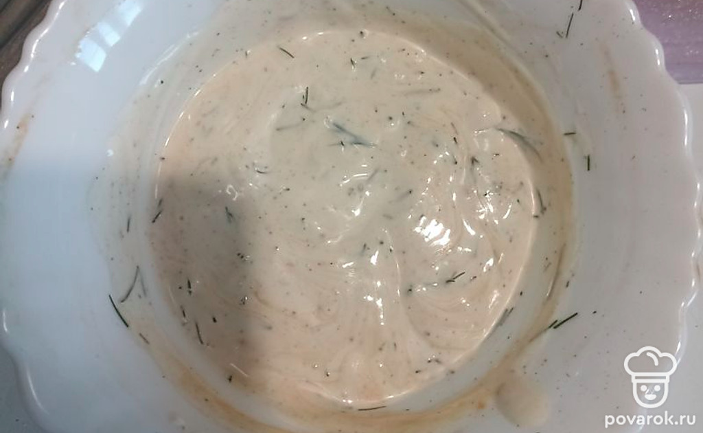 Делаем соус: смешиваем майонез, сметану, зелень, чеснок, специи.