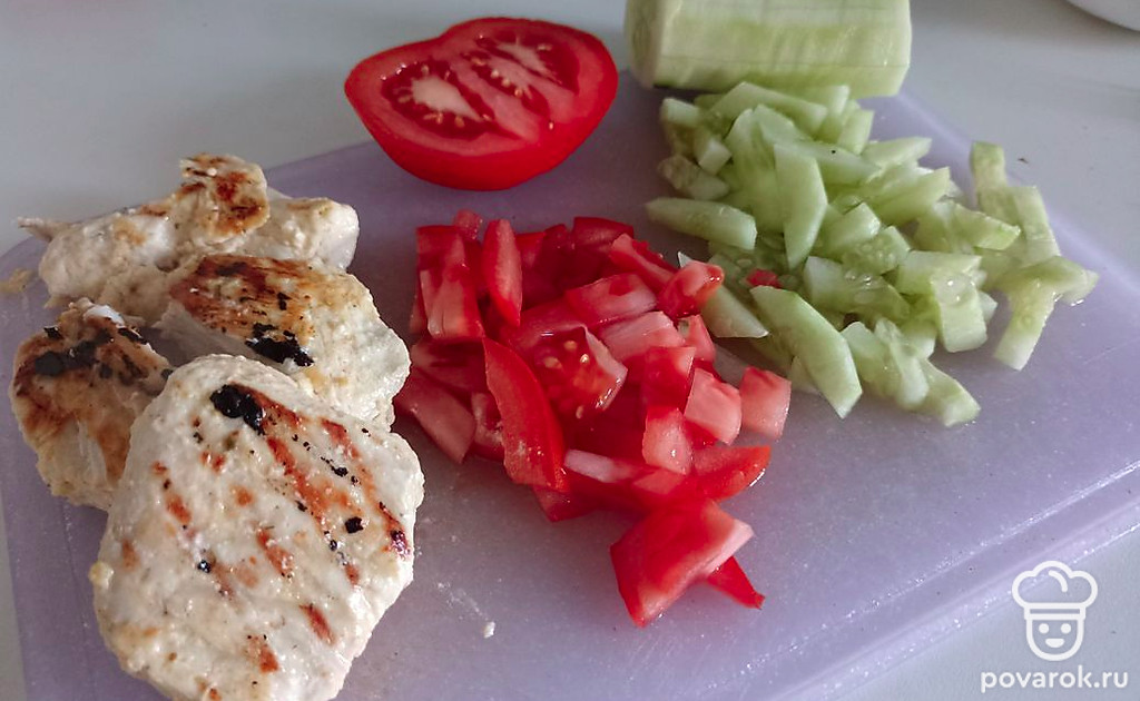 Нарезаем овощи. Курицу заранее жарим и режем на кусочки.