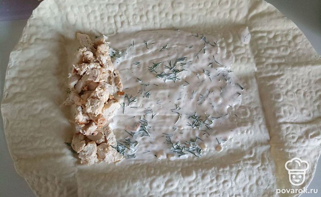 Лаваш смазываем соусом, кладем курицу, овощи, еще соус.
