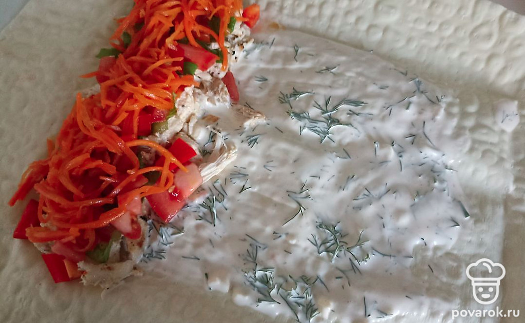 Добавляем корейскую морковку и заворачиваем лаваш.