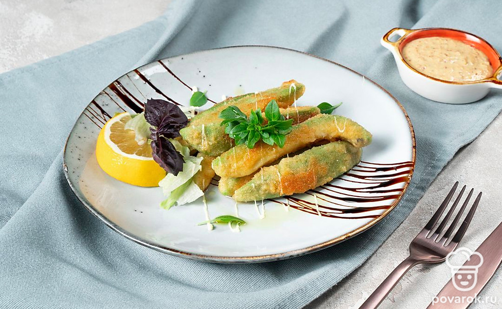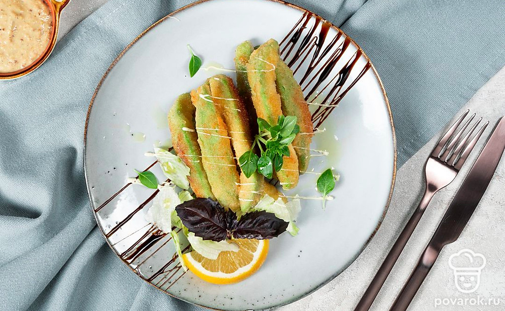 Жареное авокадо разложите по плоским порционным тарелкам, подайте с горчичным соусом.