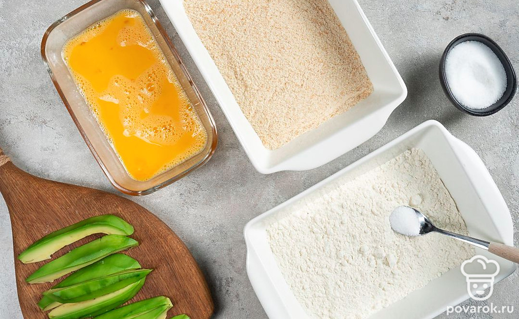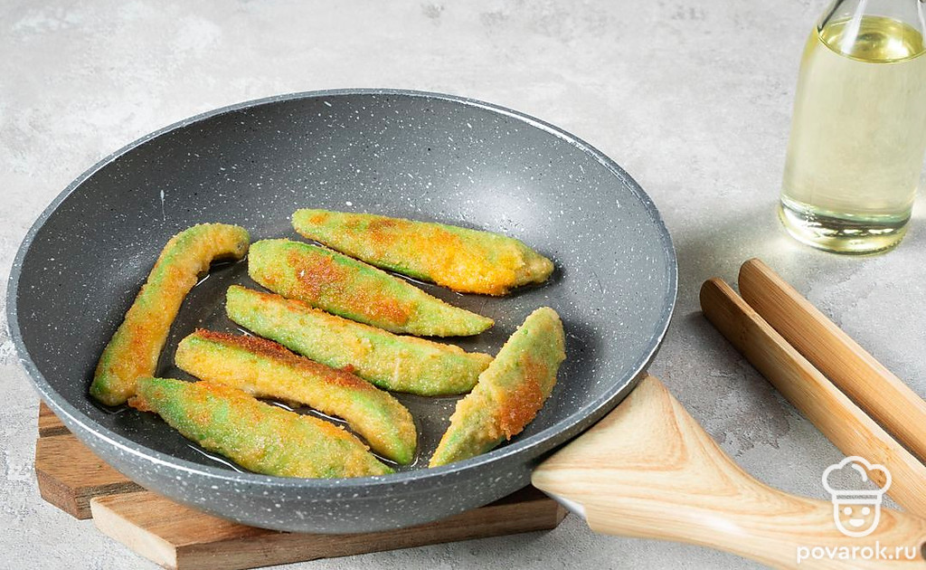 Пожарьте авокадо. Поставьте сковороду с маслом разогреваться. В это время присыпьте кусочки авокадо мучной смесью, затем окуните в льезон, запанируйте в сухарях. Обжарьте подготовленные ломтики до румяности. Немного обсушите на бумажных полотенцах.