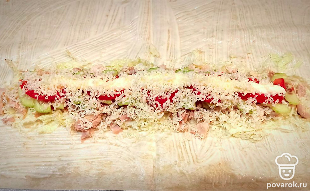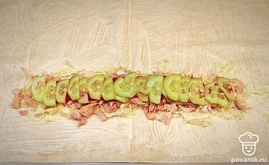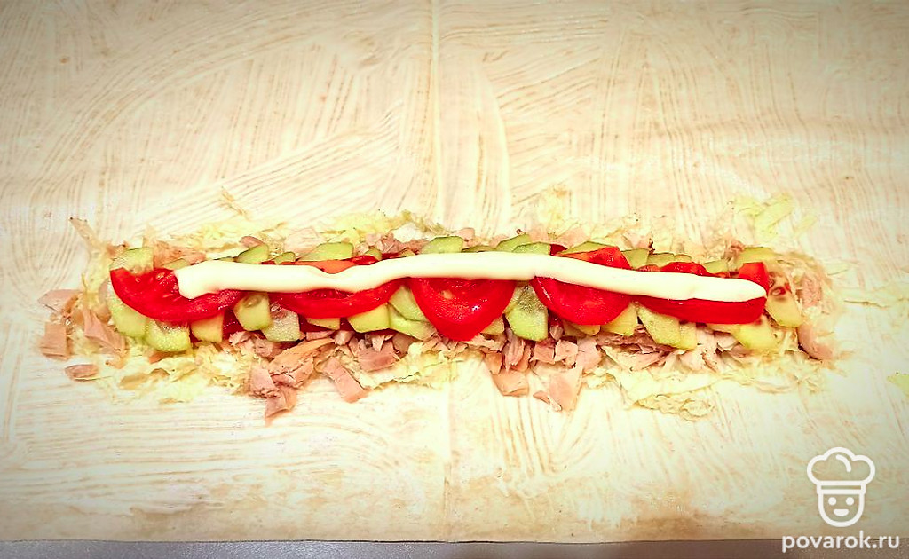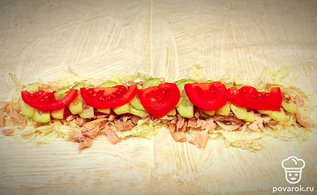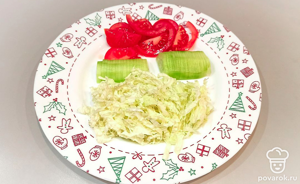 Нарезаем мелко помидор и огурец. От салата отделяем кочерыжку и мелко нарезаем зелень.
