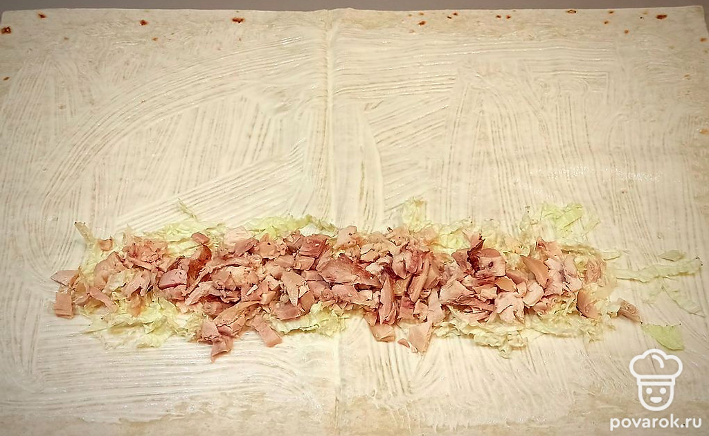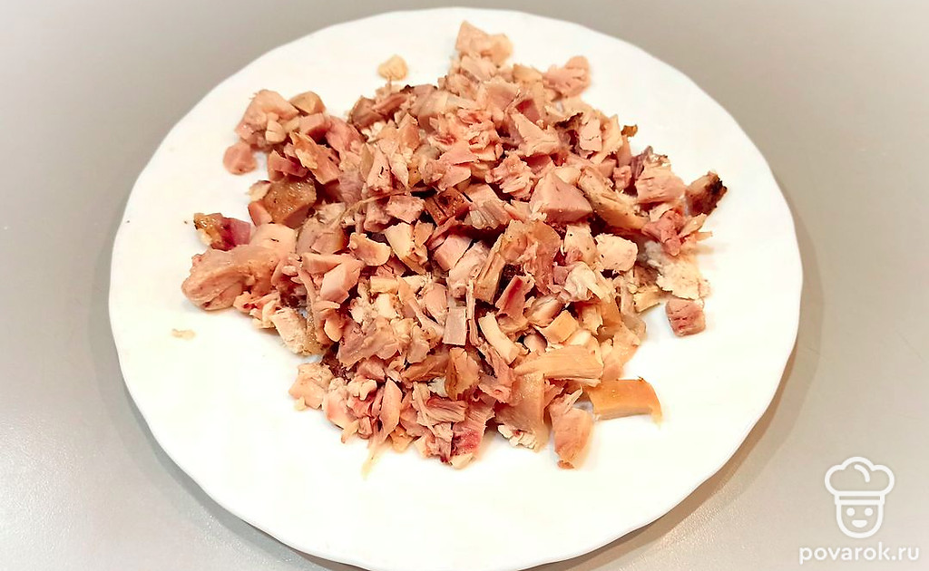 Некрупно нарезаем отваренную или обжаренную куриную грудку. У меня была обжаренная.