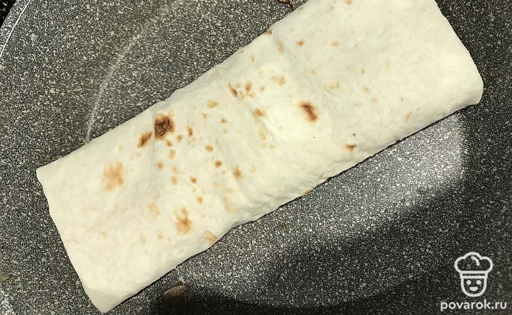 Выложить жареное яйцо и сыр по желанию. Свернуть и обжарить на сухой сковороде, с двух сторон по 5 минут.