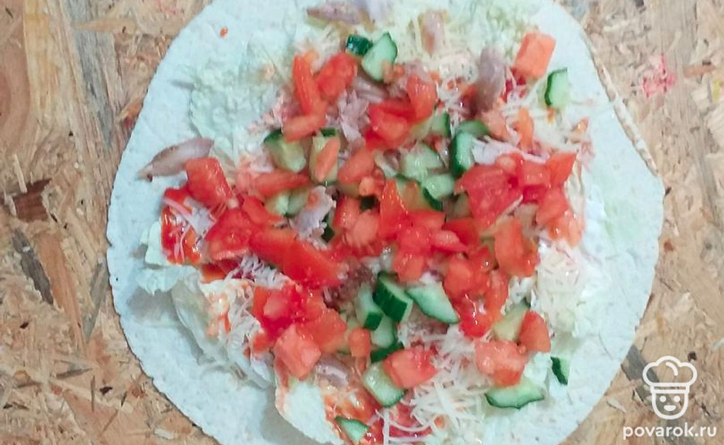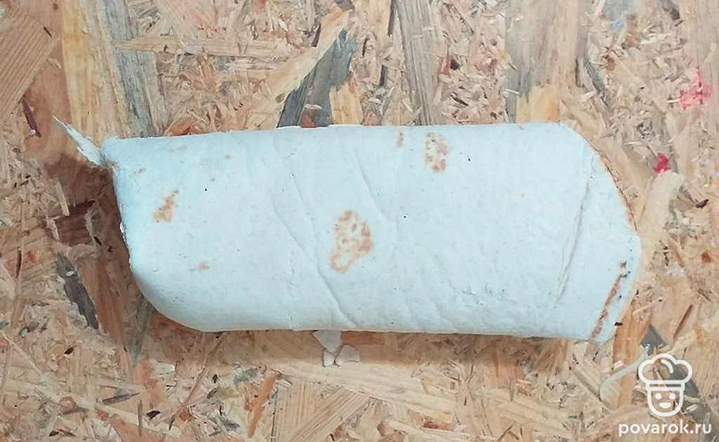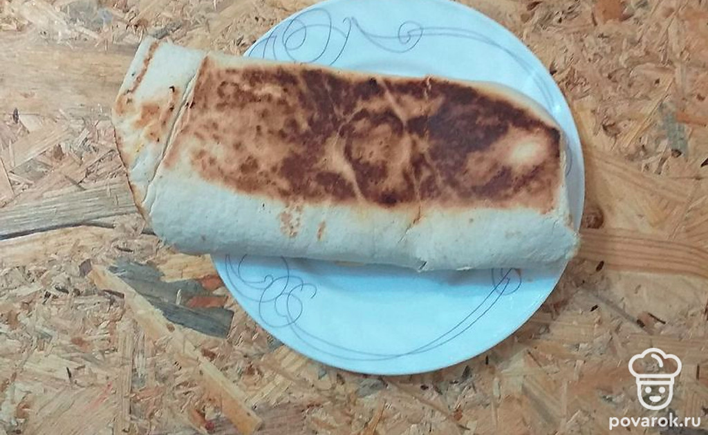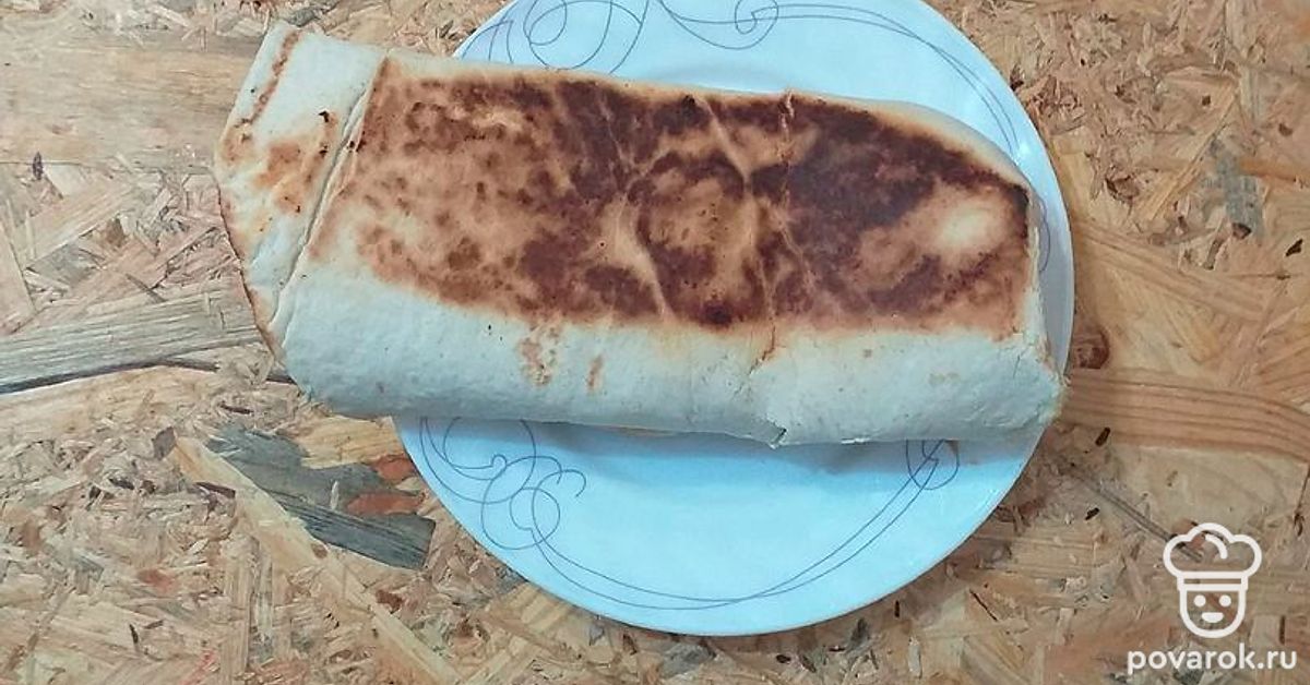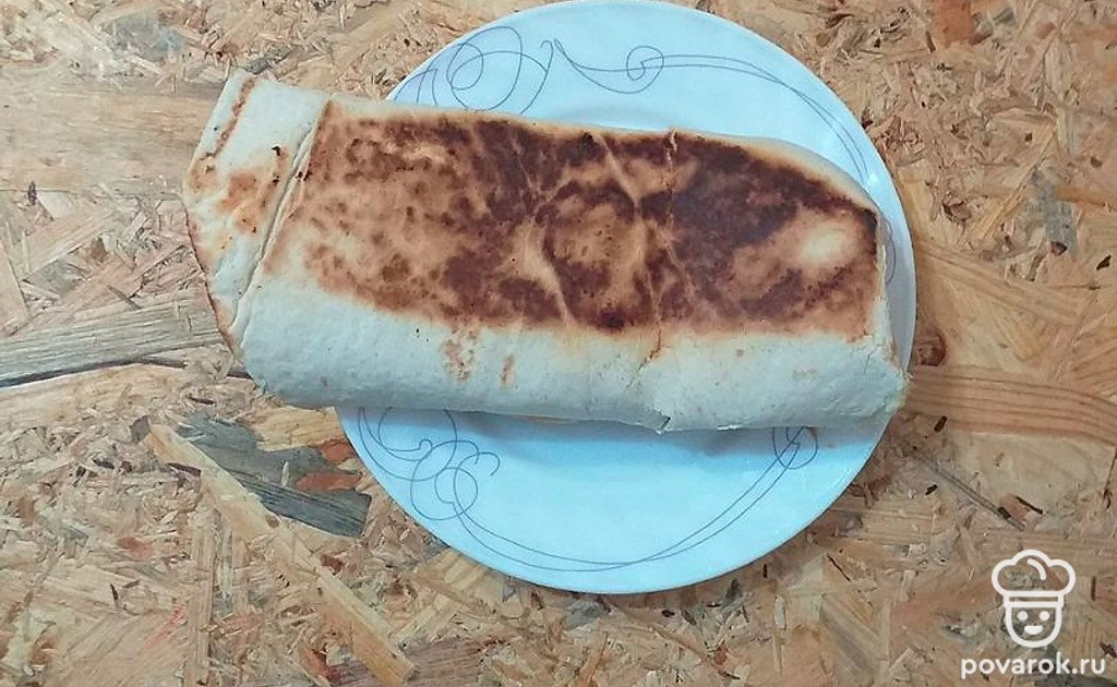 Завернуть шаверму, оставив один край открытым. Обжарить с двух сторон на сковороде или гриле по 3-5 минут.
