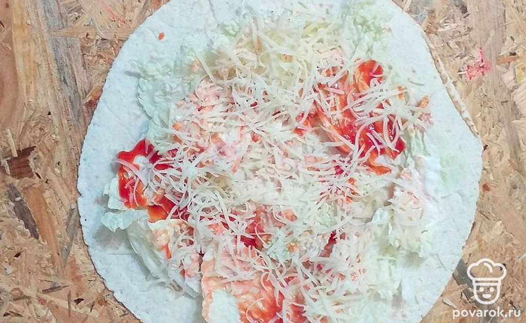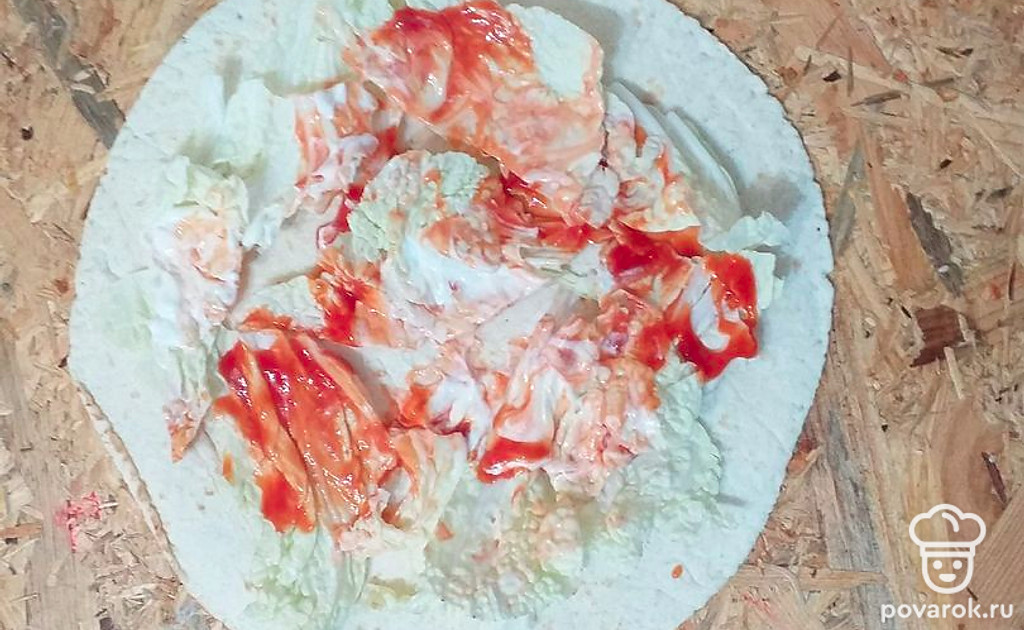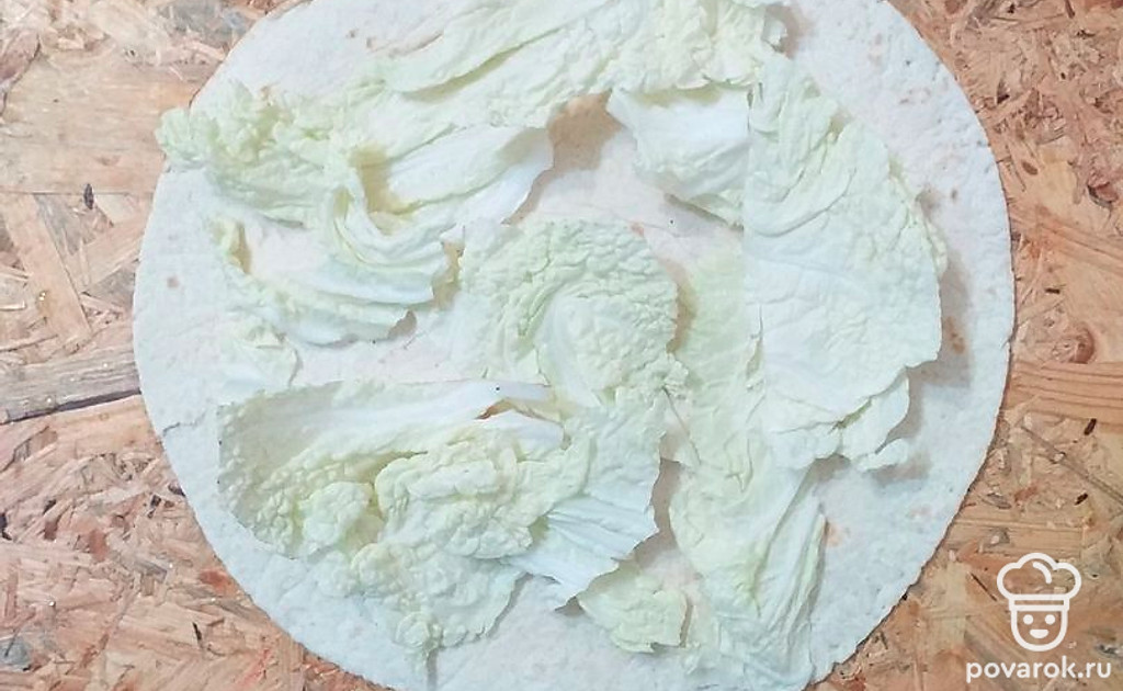 Листья пекинской капусты порвать на кусочки среднего размера, выложить на лепёшку.