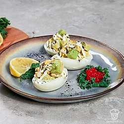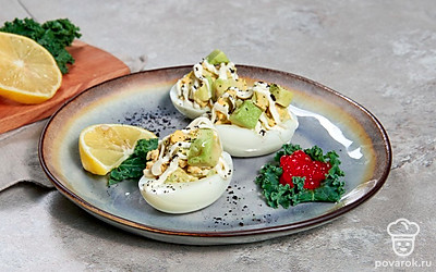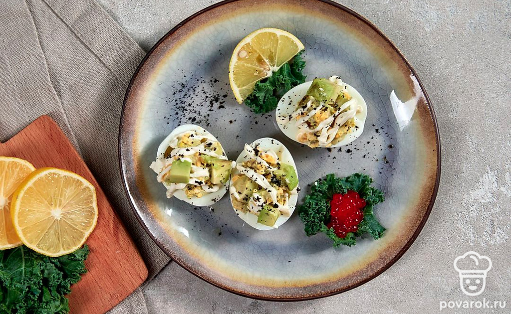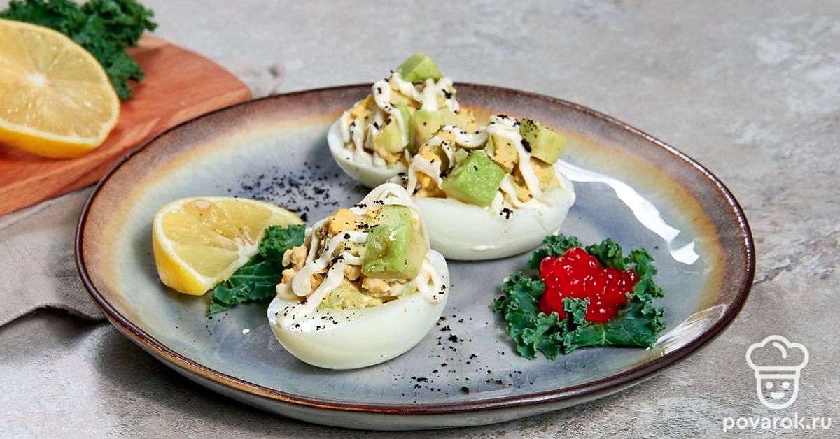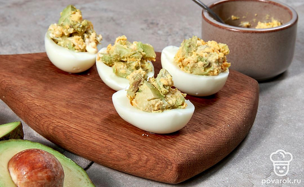 Главное преимущество закуски в виде фаршированных яиц — скорость приготовления. Какая бы ни была начинка, всегда можно управиться за 10-15 минут максимум. Полезная и сытная, закуска поднимет настроение и поможет перенести ожидание, например, перед основным блюдом. Авокадо содержит огромное количество витаминов, и несмотря на то, что он является калорийным, его часто употребляют при похудении. Вкус авокадо раскрывается намного ярче, если сбрызнуть его лимонным соком, посолить и поперчить.