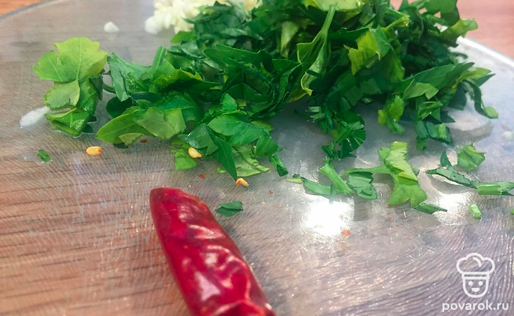 Нарежем мелко овощи – чеснок, петрушку. Острый перчик возьмем для того, чтобы натереть на терке.